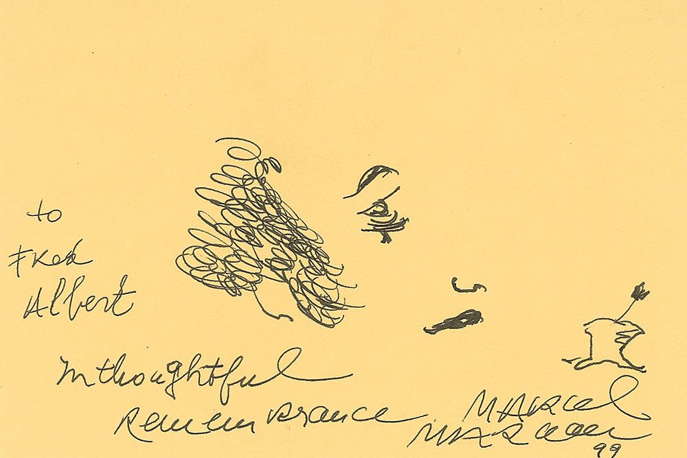 Original signed and inscribed felt tip self-portrait on a beige 6 x 4 card, signed and inscribed, “To Fred Albert, In thoughtful remembrance, Marcel Marceau, 99.” In fine condition.
