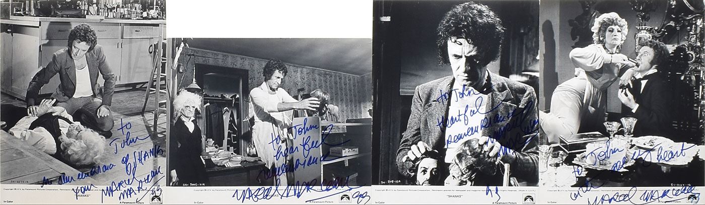 Four glossy Paramount Pictures publicity photos for the 1974 horror film Shanks, 8 x 10 and 10 x 8, each signed in blue felt tip, "Marcel Marceau, 93," who adds an inscription "To John" on each photo. In overall fine condition, with some light creasing to one of the photos.
