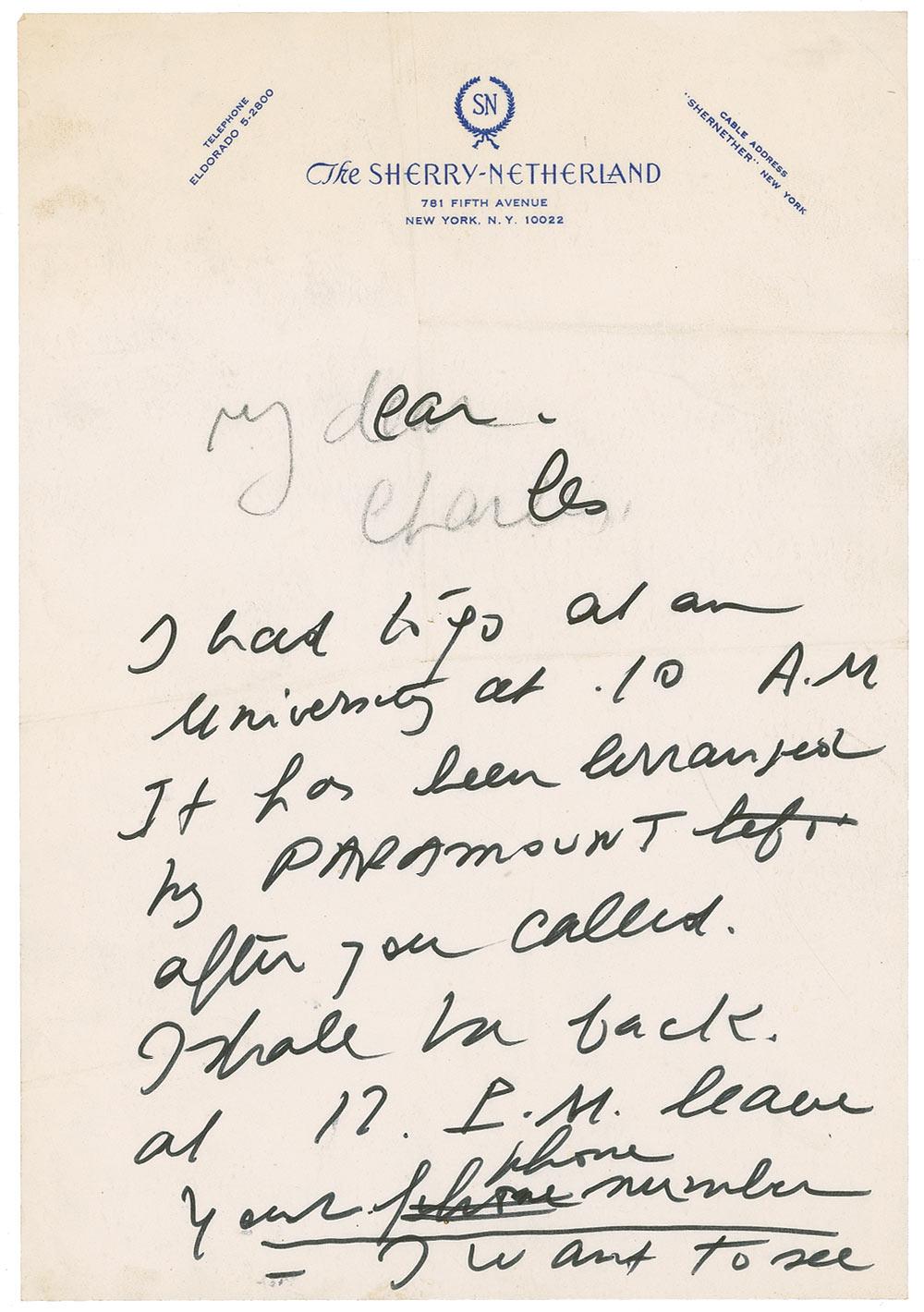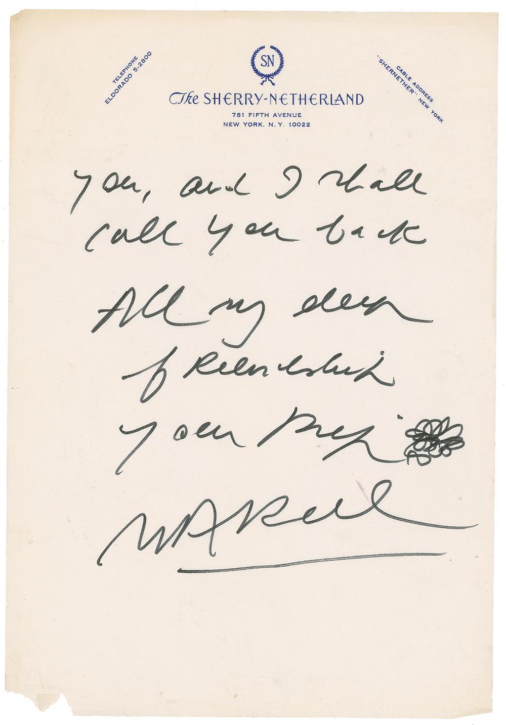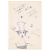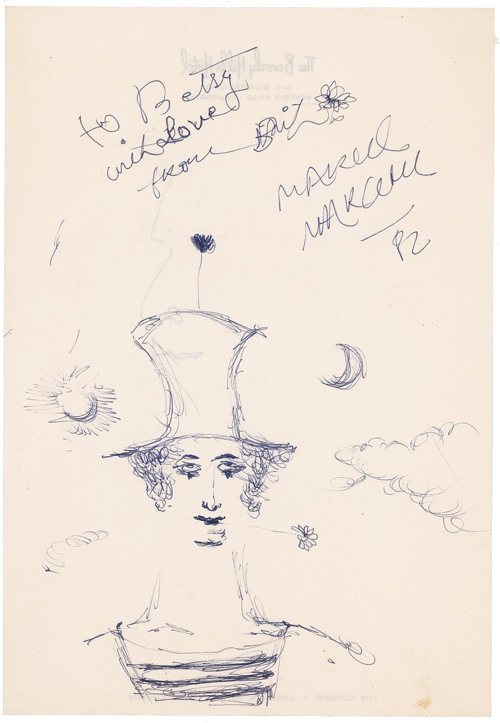 Original ink self-portrait sketch on an off-white 7.25 x 10.5 sheet, signed and inscribed at the top, “To Betty, with love from Marcel Marceau 82,” adding a small flower sketch as well. Accompanied by an ALS, signed “Marcel,” two pages, 7.5 x 10.5, Sherry-Netherland Hotel letterhead. Marceau writes to his friend Charles. In part: “I had to go at an university at 10 AM. It had been arranged by Paramount after you called. I shall call you back.” In fine condition, with intersecting folds and some mild toning to letter. A wonderful sketch, truly capturing the essence of the mime who drew it!