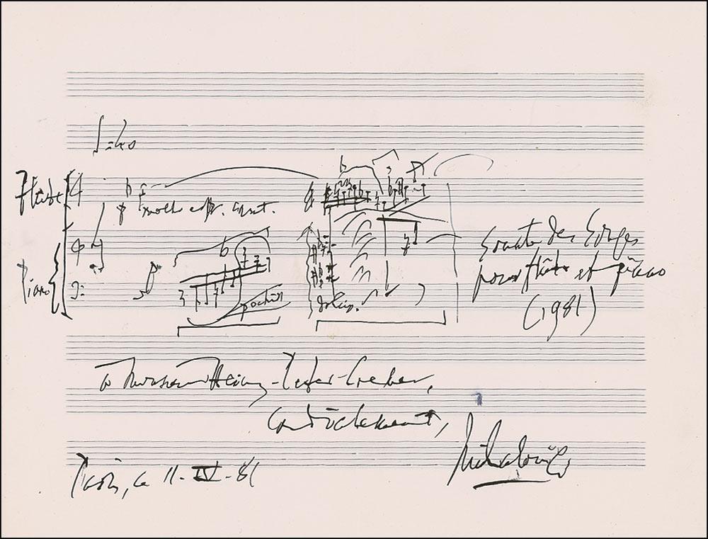French composer (1898–1985). Intricate AMQS on a 10 x 7.75 sheet of musical manuscript paper. Mihalovici pens several bars of music for a sonata for flute and piano, signed and inscribed under the quote and dated April 11, 1981. In fine condition, with a central vertical and horizontal fold. RRAuction COA.