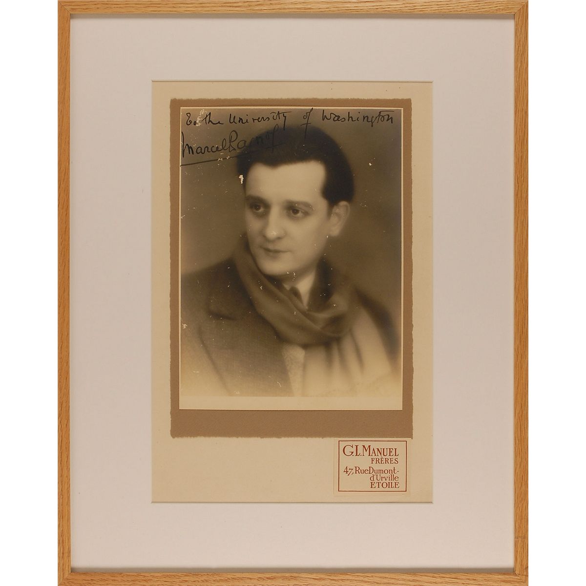 French novelist, playwright, and filmmaker (1895-1974). Vintage matte-finish 7.75 x 10.5 photo by G.L. Manuel Freres, and affixed to its original 8.5 x 12 mount, signed and inscribed in fountain pen “To the University of Washington, Marcel Pagnol.” Matted