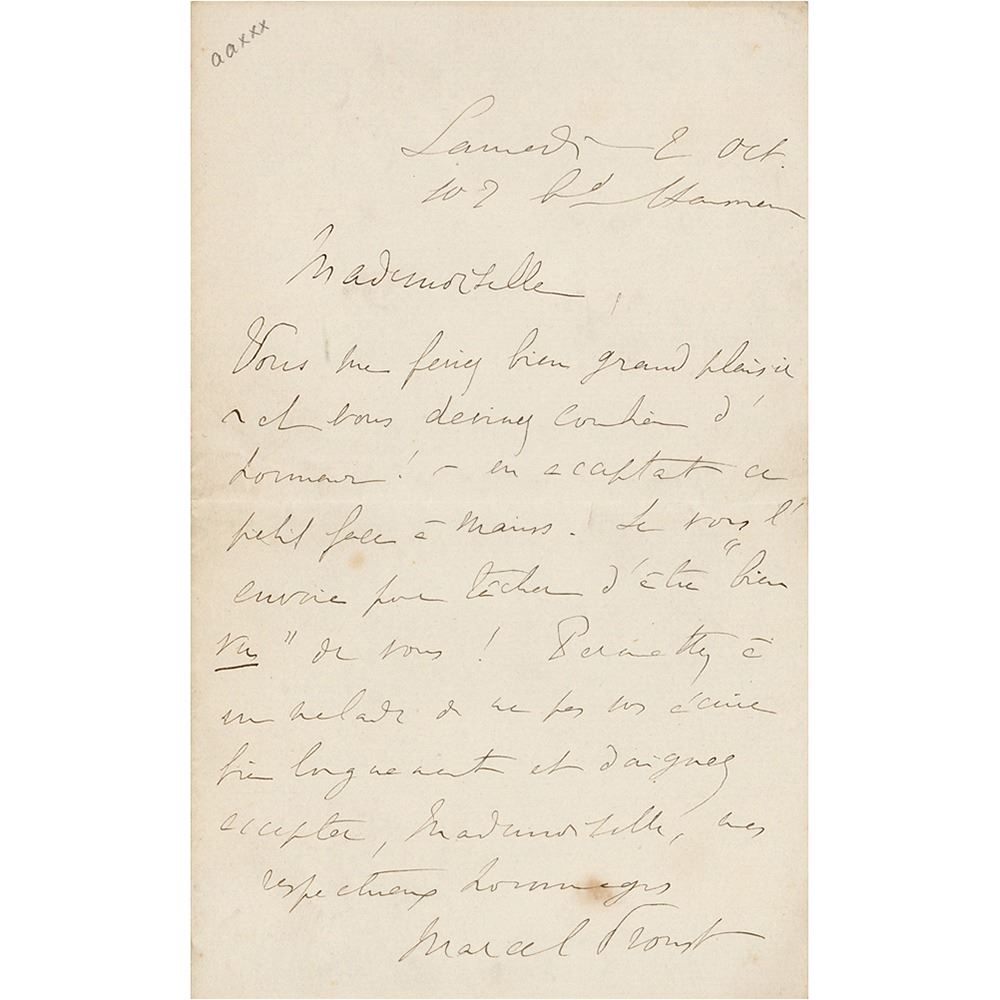 French writer (1871"“1922) known for the monumental sixteen-volume In Search of Lost Time, regarded as one of the greatest achievements in world literature. ALS in French, one page, 5 x 8, October 2, [no year but circa 1906"“1919]. Handwritten letter from his famous address at "102 Bd Haussmann," where he lived from 1906 to 1919, and where he wrote most of In Search of Lost Time. In full (translated): "You would give me very great pleasure and you can guess a great honor by accepting this small fan. I send it to you to be 'well regarded' by you. Please allow a sick man not writing more for much longer and please deign to accept mademoiselle my respectful homage." In fine condition, with a small stain touching the closing.