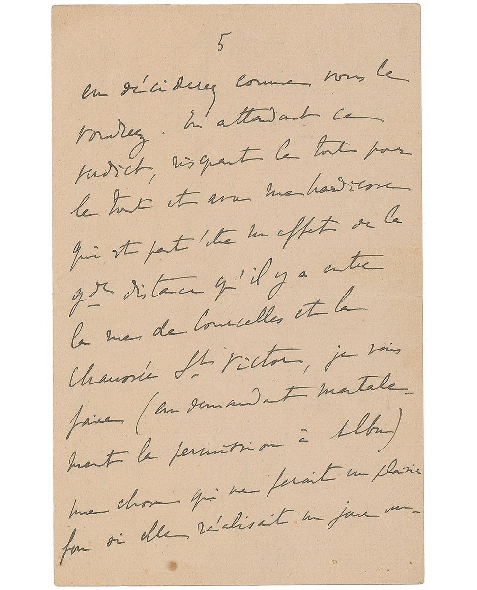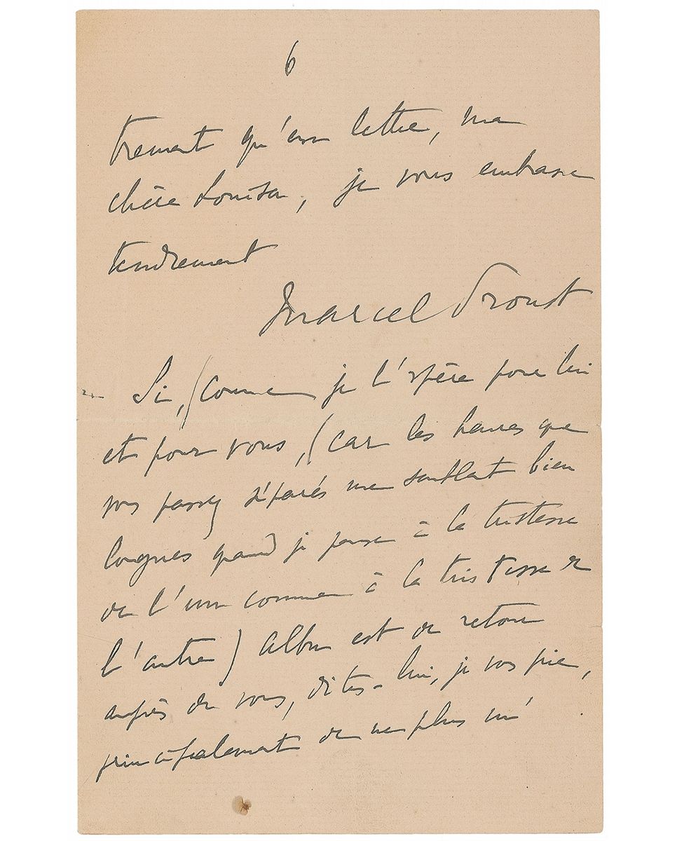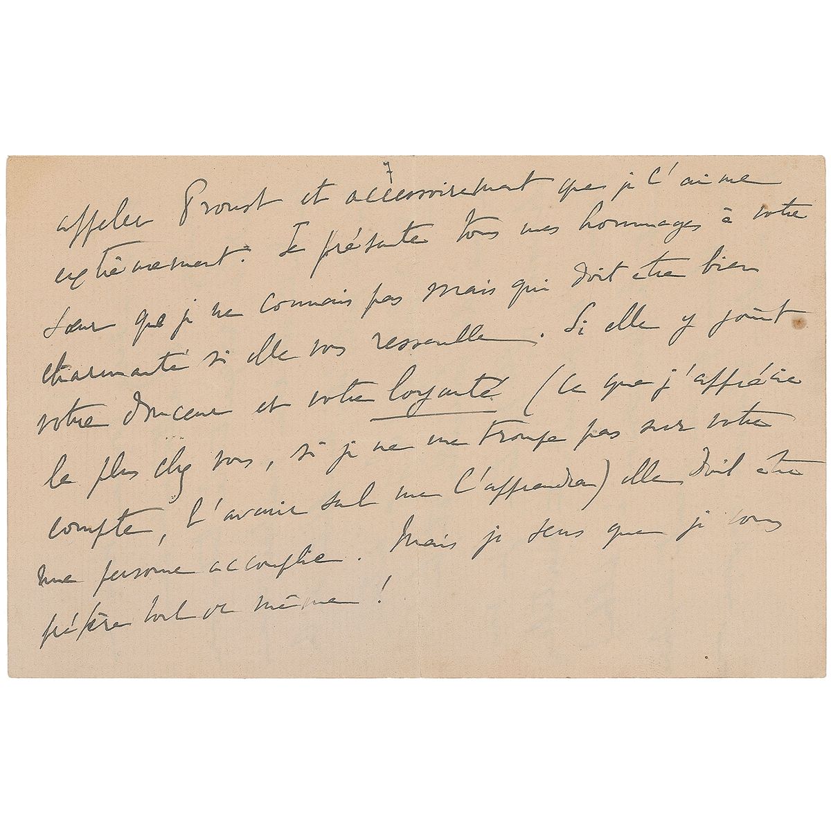 Partial ALS in French, signed “Marcel Proust,” three pages on two adjoining sheets, 4.5 x 7, no date. The concluding portion of a letter to Louisa Mornand, who inspired the character Rachel in Proust’s In Search of Lost Time, with content regarding her relationship with his friend Louis d'Albufera, who he fondly called "Albu." In full (translated): "will decide it as you want it. In the meantime this verdict, risking everything with a daring which is maybe the effect of the great distance that there is between rue de Courcelles and the Chaussee St. Victor, I am going to do (by asking mentally permission to Albu) a thing that would give me delirious pleasure if it were to happen one day another way than by letter, my dear Louisa, I kiss you tenderly." Proust adds a lengthy handwritten postscript, in full: "If, (as I hope for him and for you, (because the hours that we spend apart seem to me so long when I think about the sadness of one as of the sadness of the other) Albu has returned next to you, tell him, please, mainly to not call me Proust anymore and secondary that I love him extremely. Please pay my respect to your sister whom I do not know but who must be very charming if she resembles you. If she combines your sweetness and loyalty (what I appreciate the most in you, if I am not mistaking about you, the future will tell us) she must be a distinguished individual. But I sense that I prefer you all the same!" In fine condition, with a small edge separation at the adjoining fold and a couple small stains. As with most of Proust's romantic endeavors, his relationship with Mornand was complex. She was the mistress of his close friend Louis d'Albufera, yet he was also at times wildly attracted to her—a sentiment exposed in this letter and others sent to her, which were at times very risqué and suggestive. In his great 1959 biography of the writer, George Painter suggests that Proust 'succumbed to her charm partly because she was the beloved of a friend [Louis d'Albufera], but partly for her own sake.' An exceptional letter closely associated with Proust's inextricably entangled life and work.