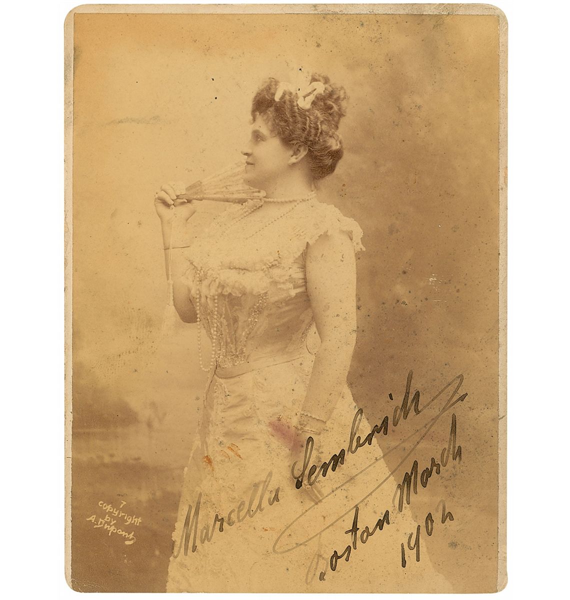 Polish soprano (1858–1935) who enjoyed a lengthy career at the New York Metropolitan Opera. Original 4.25 x 5.5 cabinet photo of Sembrich holding a fan, by A. Dupont, signed at the bottom of the image in black ink, “Marcella Sembrich, Boston, March 1902.” In very good condition, with trimmed bottom edge, scattered spotting and rubbing to image, as well as a bit of light soiling.