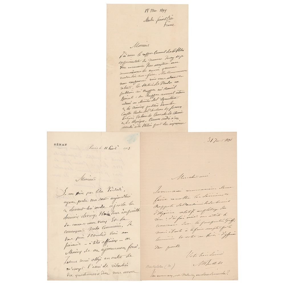French chemist and politician (1827-1907) noted for the Thomsen–Berthelot principle of thermochemistry. Three untranslated ALSs in French, each signed "M. Berthelot," totaling five pages on three sheets, dating from 1890–1903. In overall fine condition.