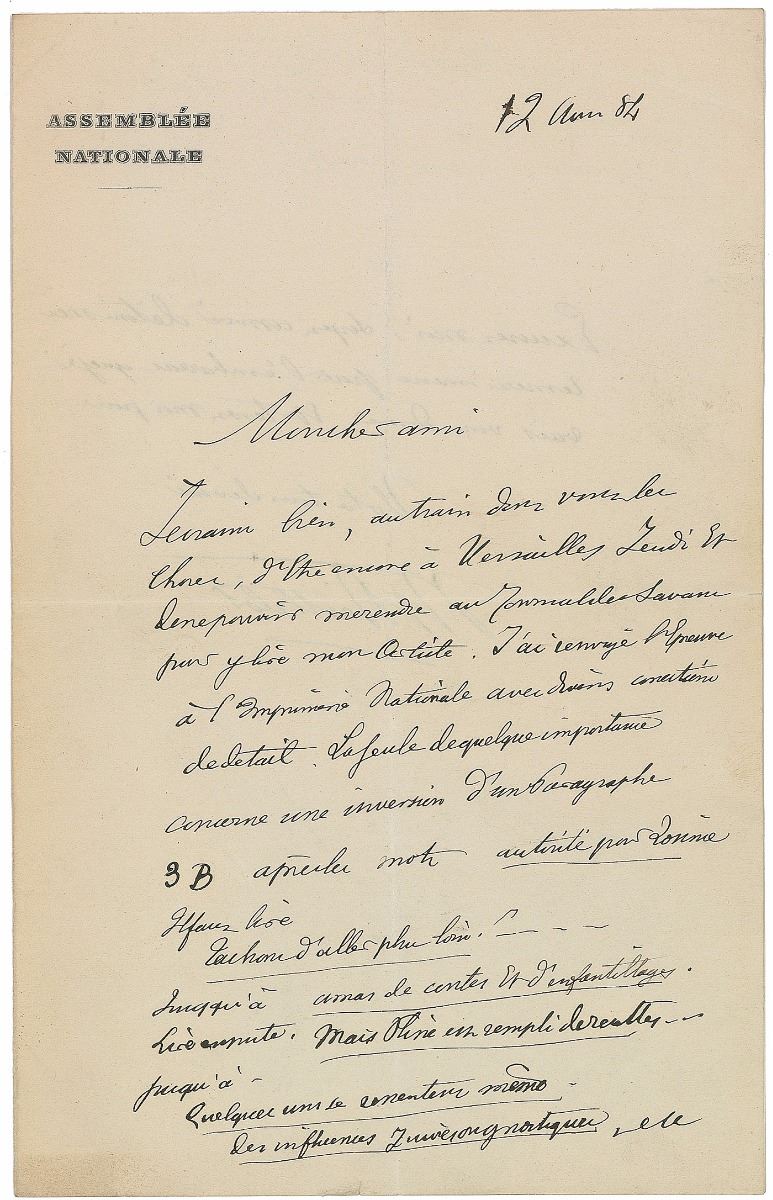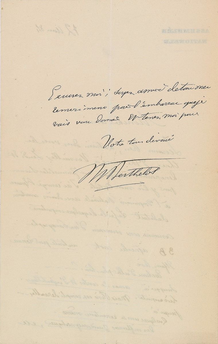 French chemist and politician (1827–1907). Untranslated ALS in French, signed “M. Berthelot,” one page both sides, 5.25 x 8.25, Assemblee Nationale letterhead, 1884. In fine condition, with central vertical and horizontal folds passing through the signature.