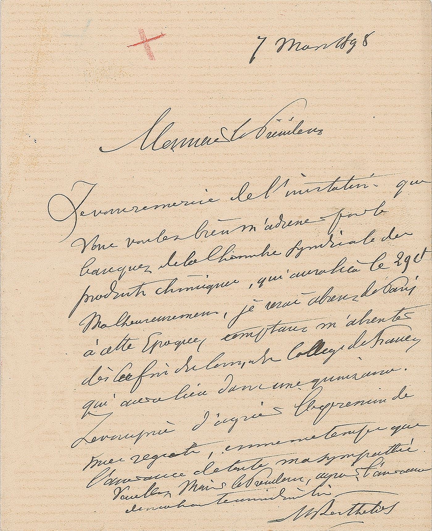 French chemist and politician (1827–1907). Untranslated ALS in French, signed “M. Berthelot,” one page, 4.25 x 5.25, March 7, 1898. In fine condition.