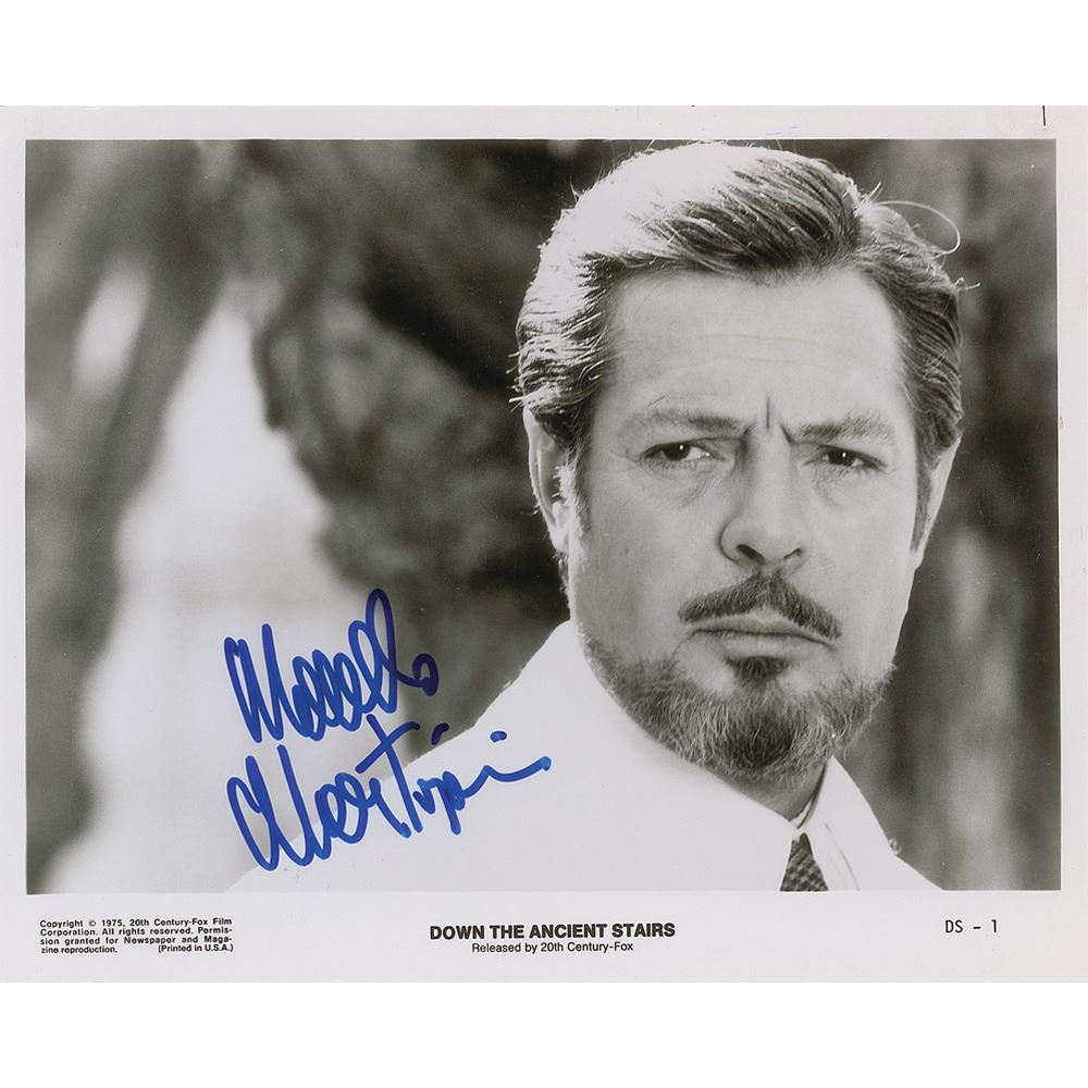 Glossy 10 x 8 promo photo for the 1975 film Down the Ancient Stairs, signed in blue felt tip by Mastroianni. In fine condition, with scattered light creasing.