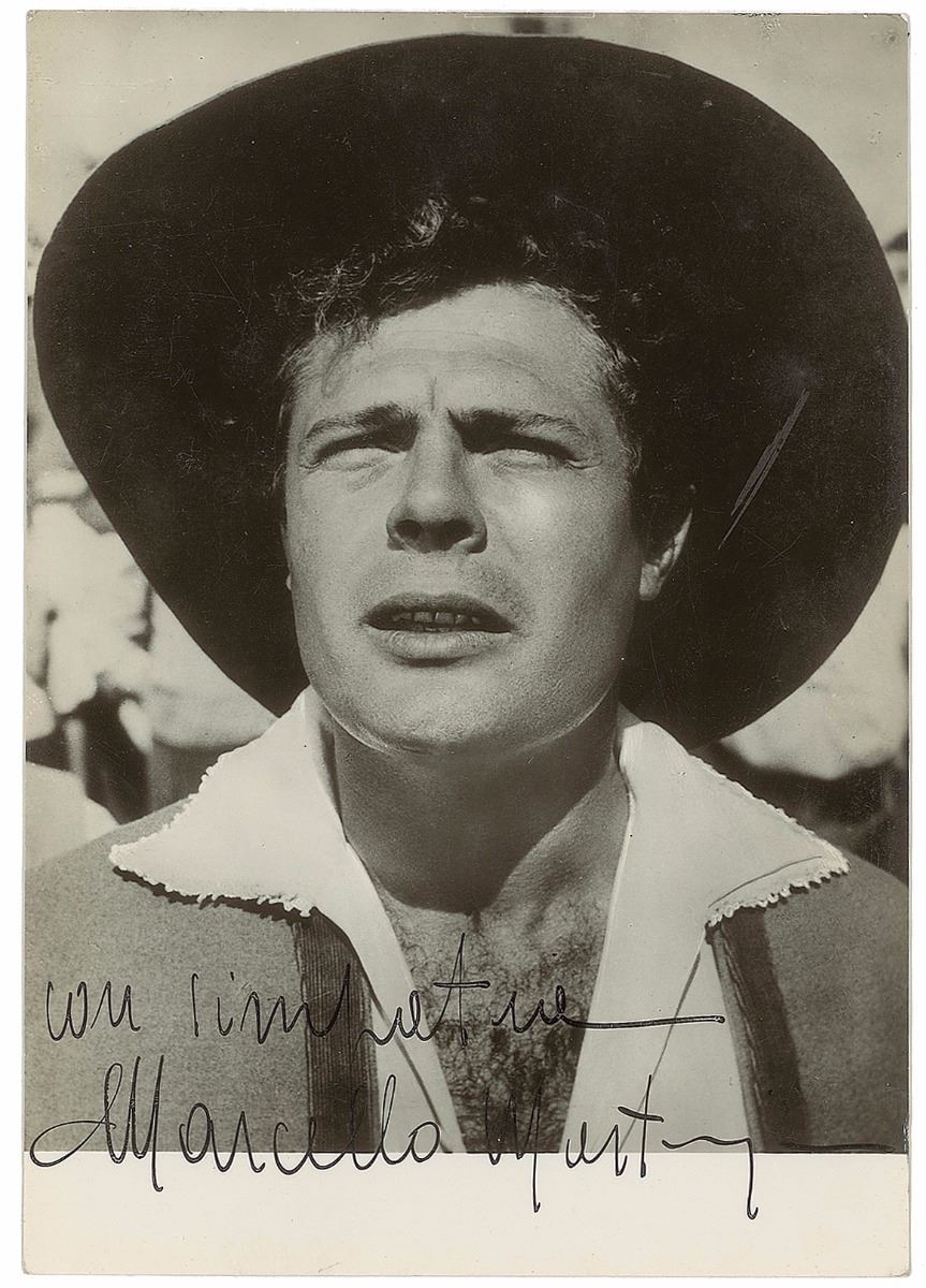 Glossy 4 x 5.75 postcard photo of Mastroianni, signed in black ink. In fine condition, with trivial creases and surface impressions.