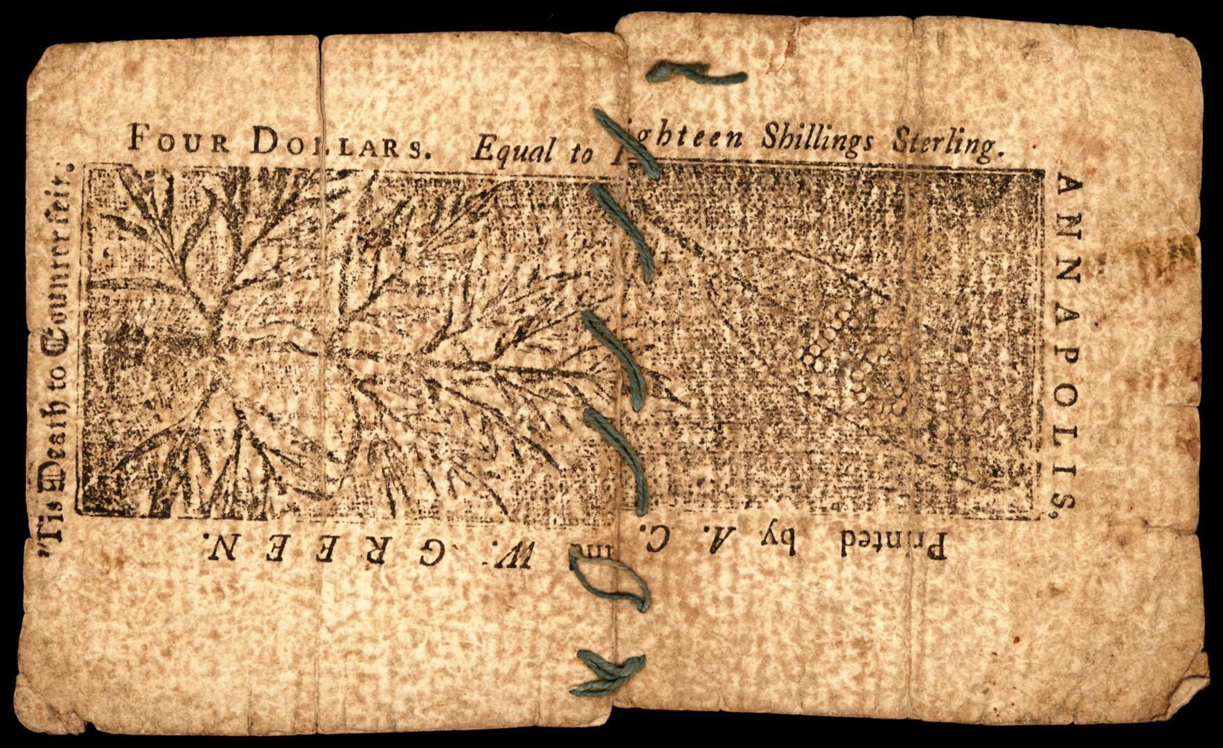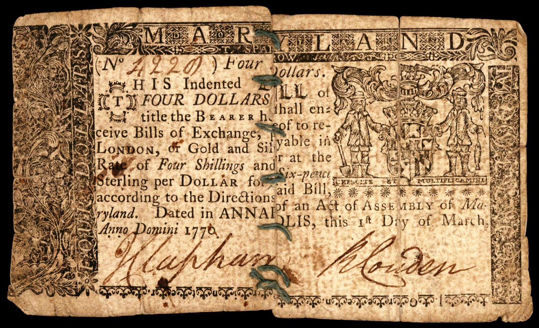 One March 1, 1770 Maryland $4 Colonial Currency Note.