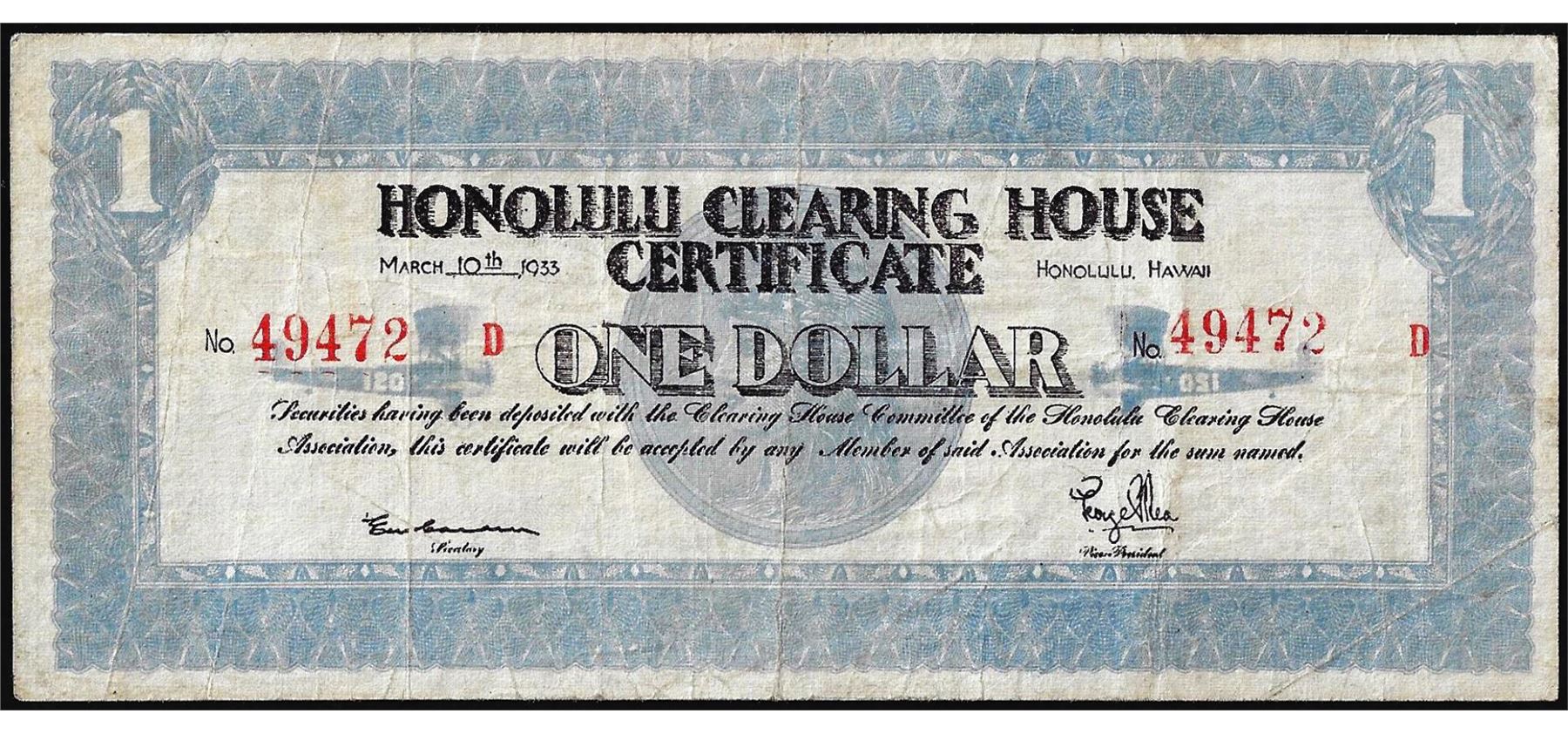 One March 10, 1933 $1 Honolulu Clearing House Certificate Note.
