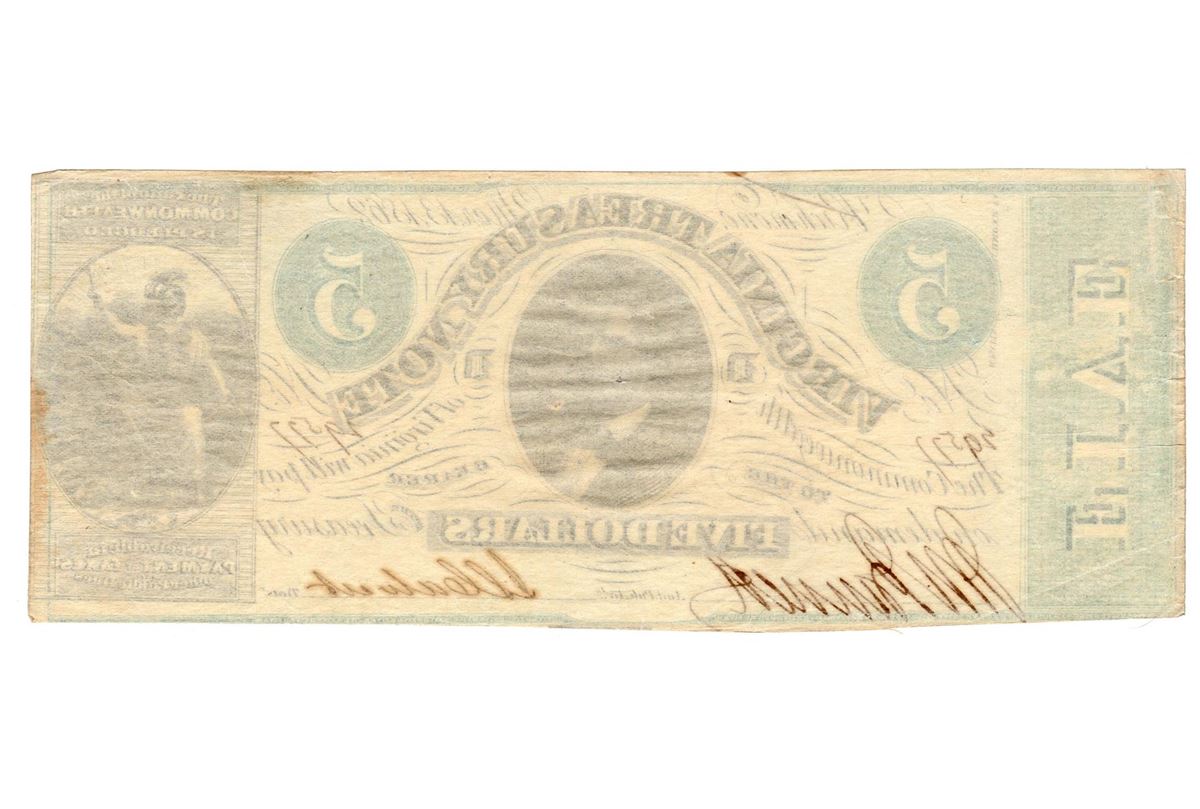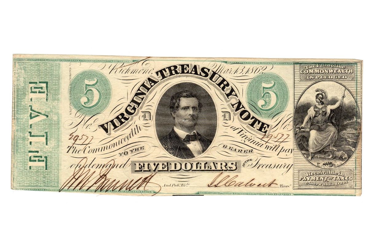 One March 13, 1862 $5 Virginia Treasury Note Obsolete.