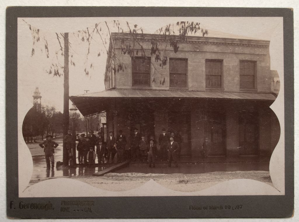Ione, California flood. Men and children on sidewalk of business.