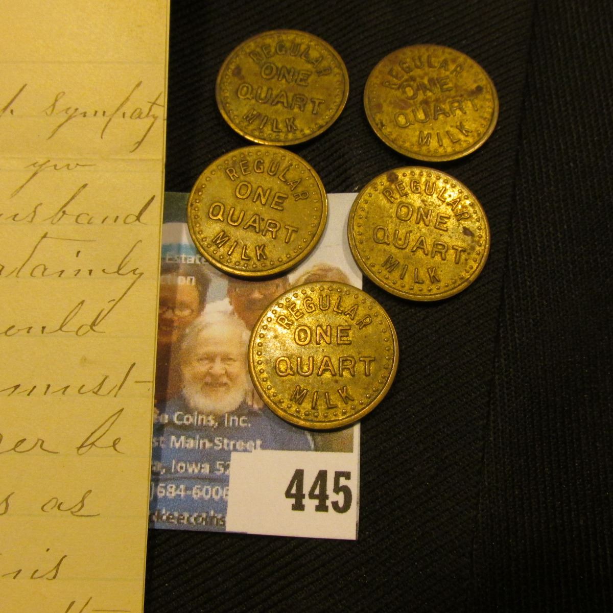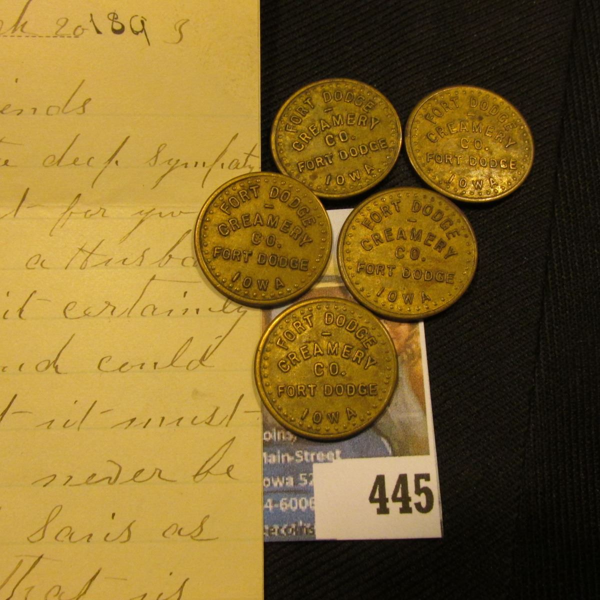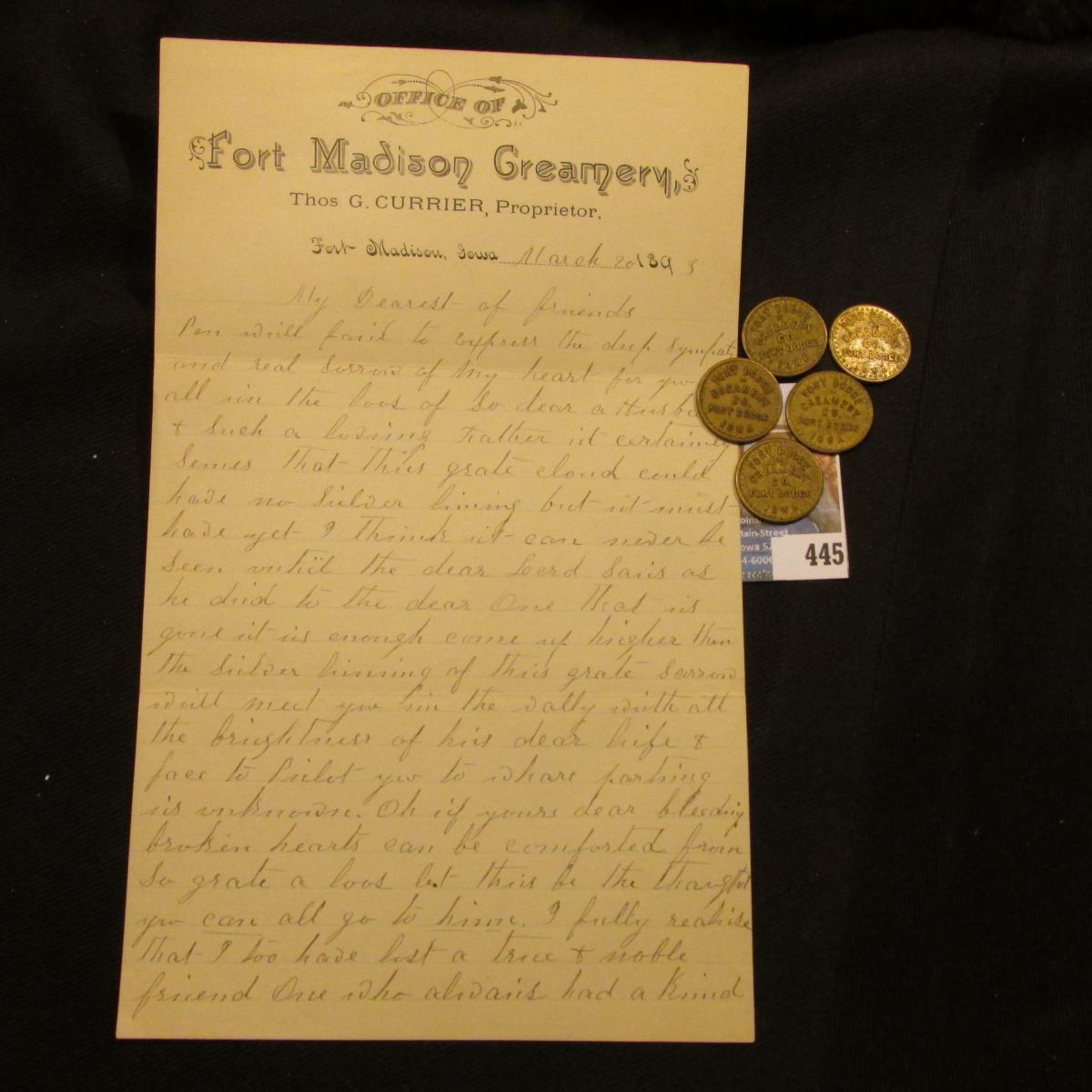 March 20, 1895 Letter on Stationery from "Office of Fort Madison Creamery Thos. G. Currier, Proprietor, Fort Madison, Iowa"; & (5) Original "Regular One Quart Milk", octagonal "Fort Dodge/Creamery/Co.Fort Dodge,/Iowa" Good for tokens.