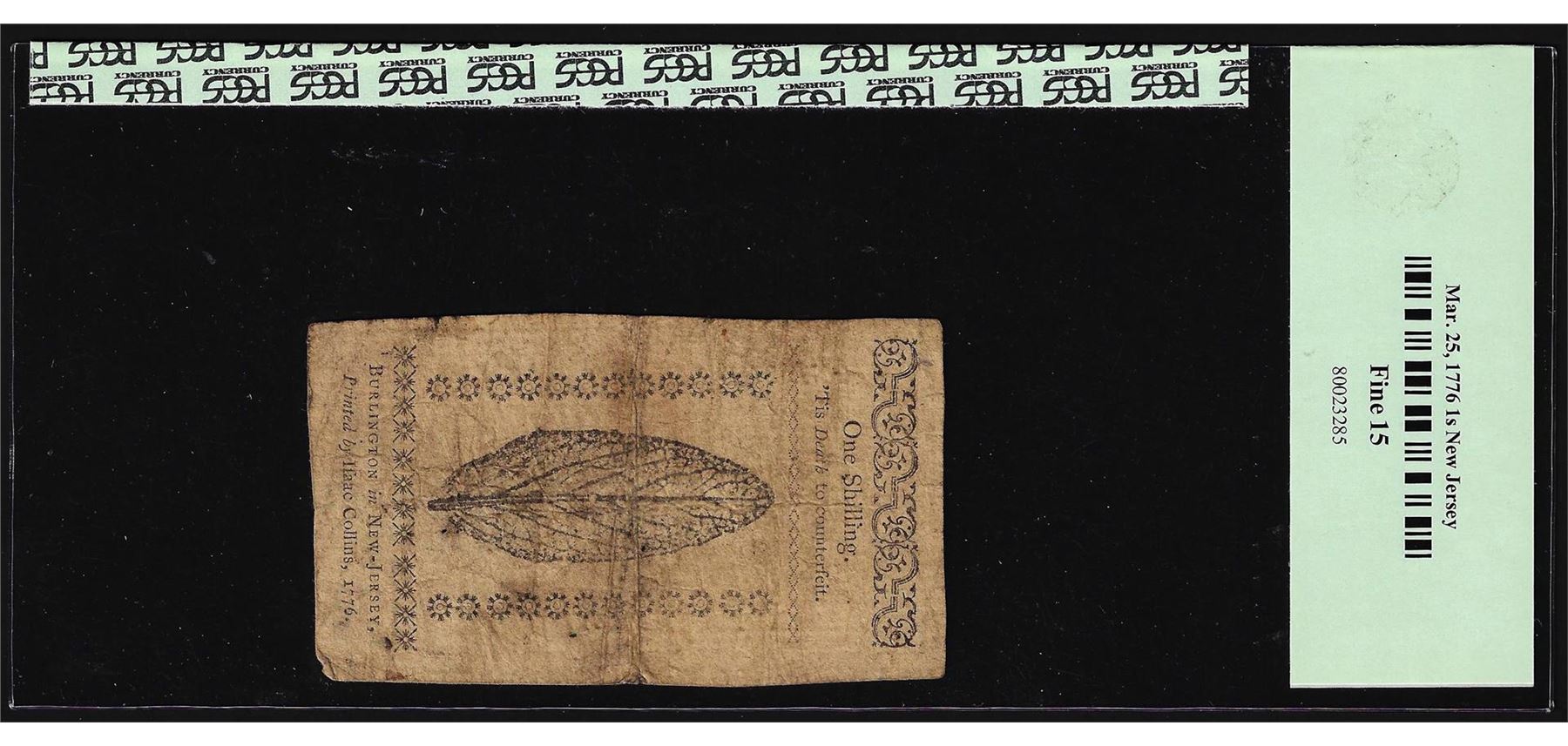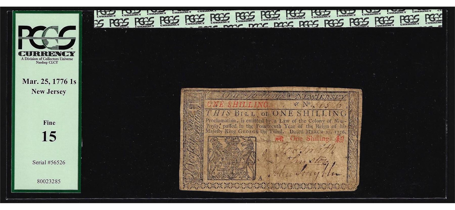 March 25, 1776 New Jersey 1 Shilling Colonial Currency Note PCGS Fine 15
