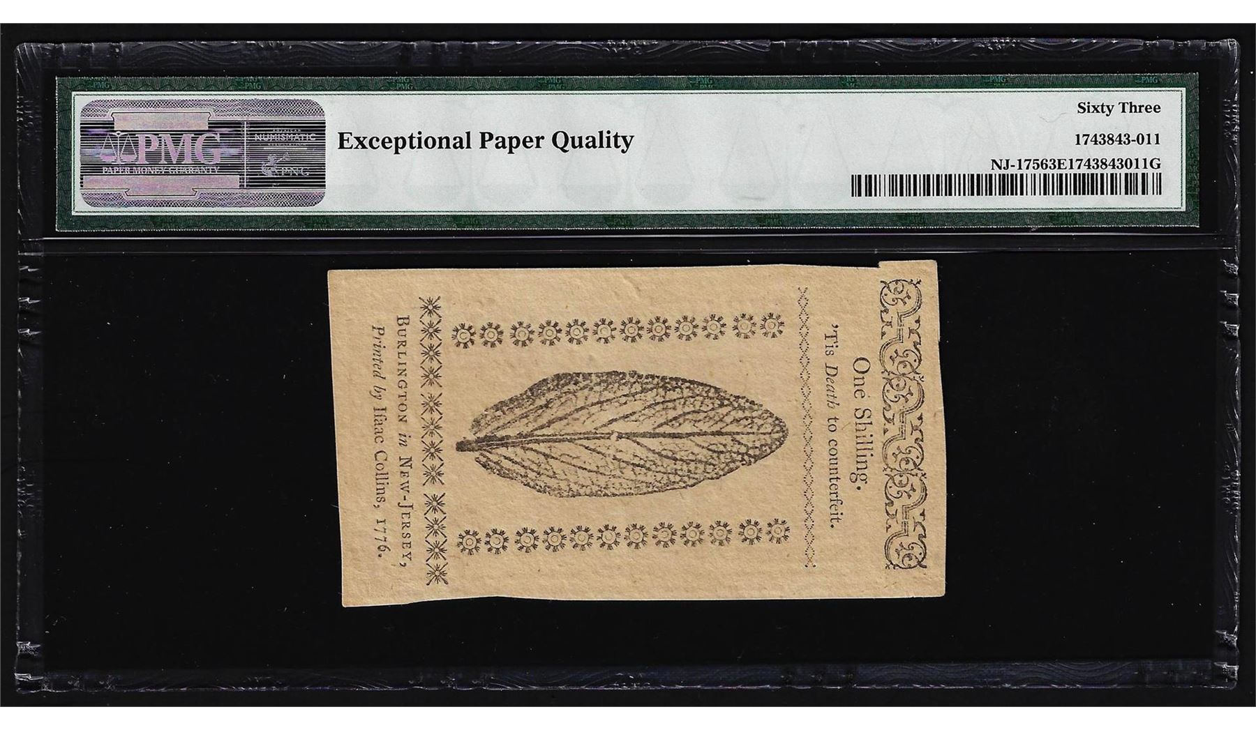 March 25, 1776 New Jersey 1 Shillings Colonial Note PMG Choice Uncirculated 63EP