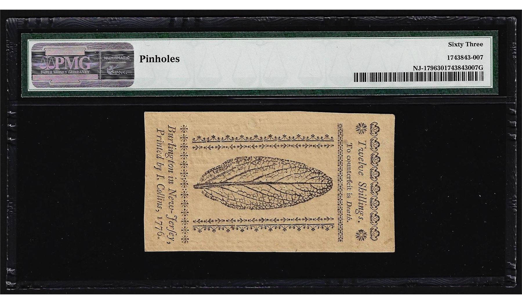 March 25, 1776 New Jersey 12 Shillings Colonial Note PMG Choice Uncirculated 63