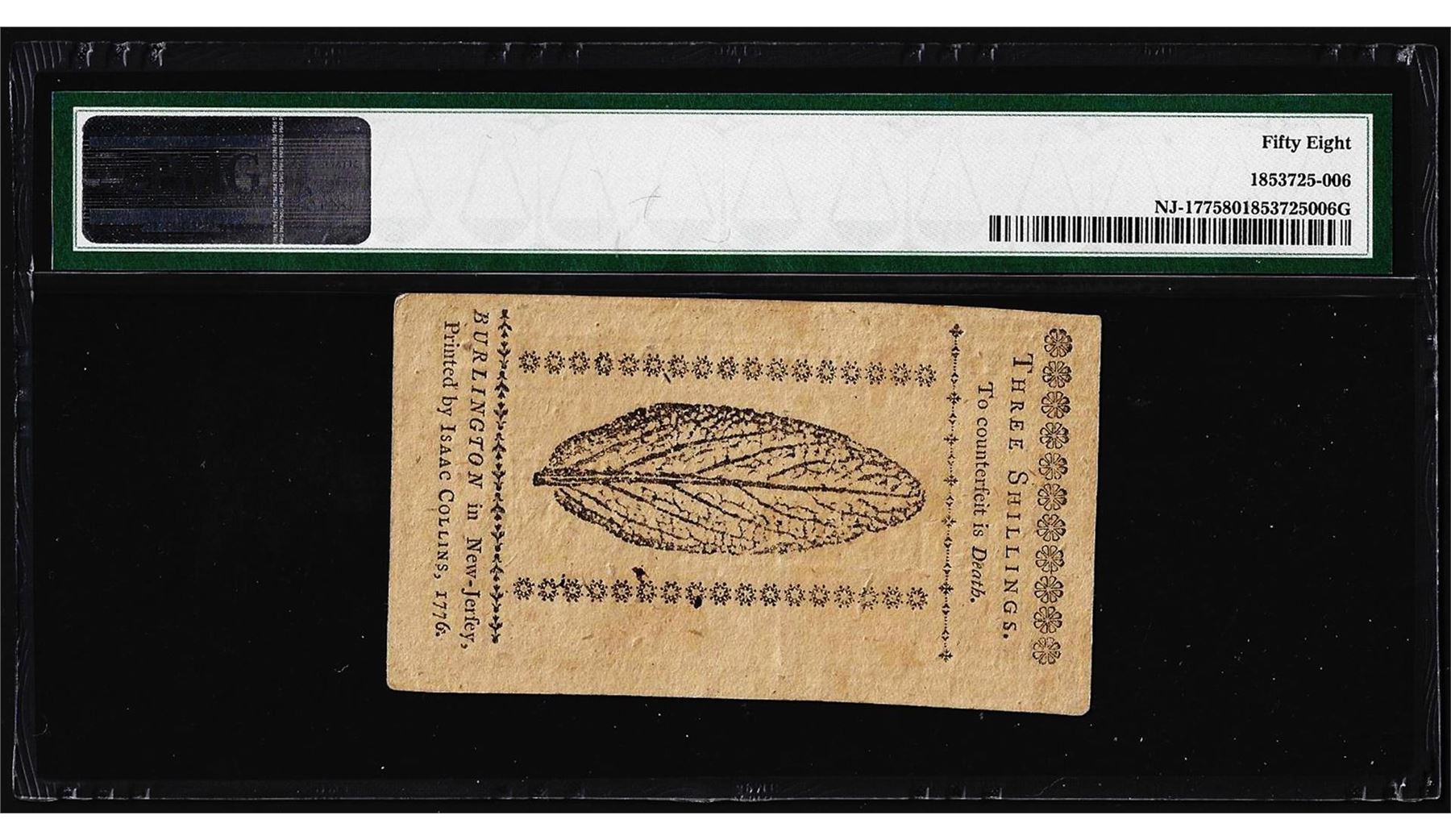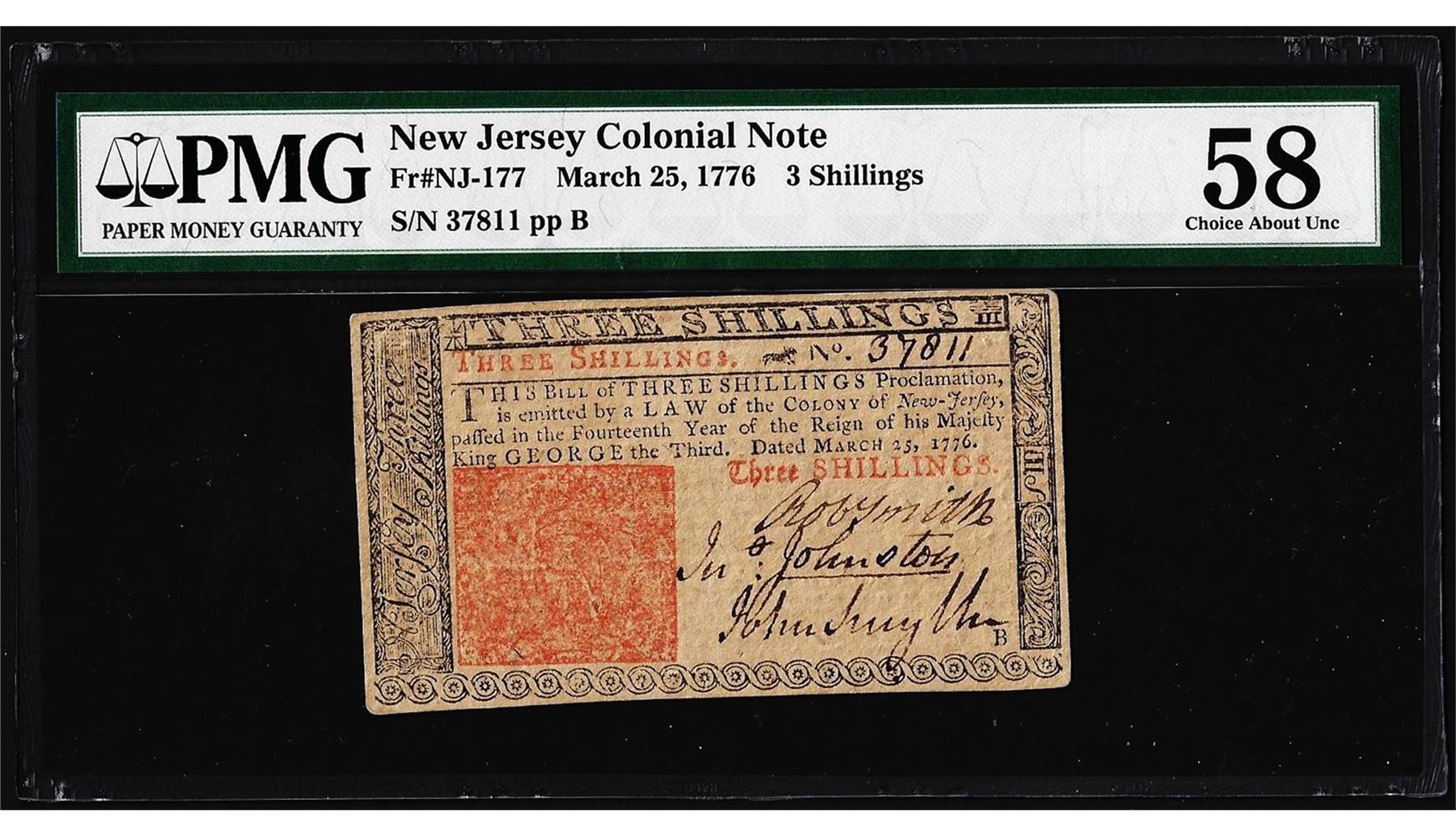 One March 25, 1776 New Jersey 3 Shillings Colonial Currency Note PMG Choice About Unc. 58. PMG Certified.