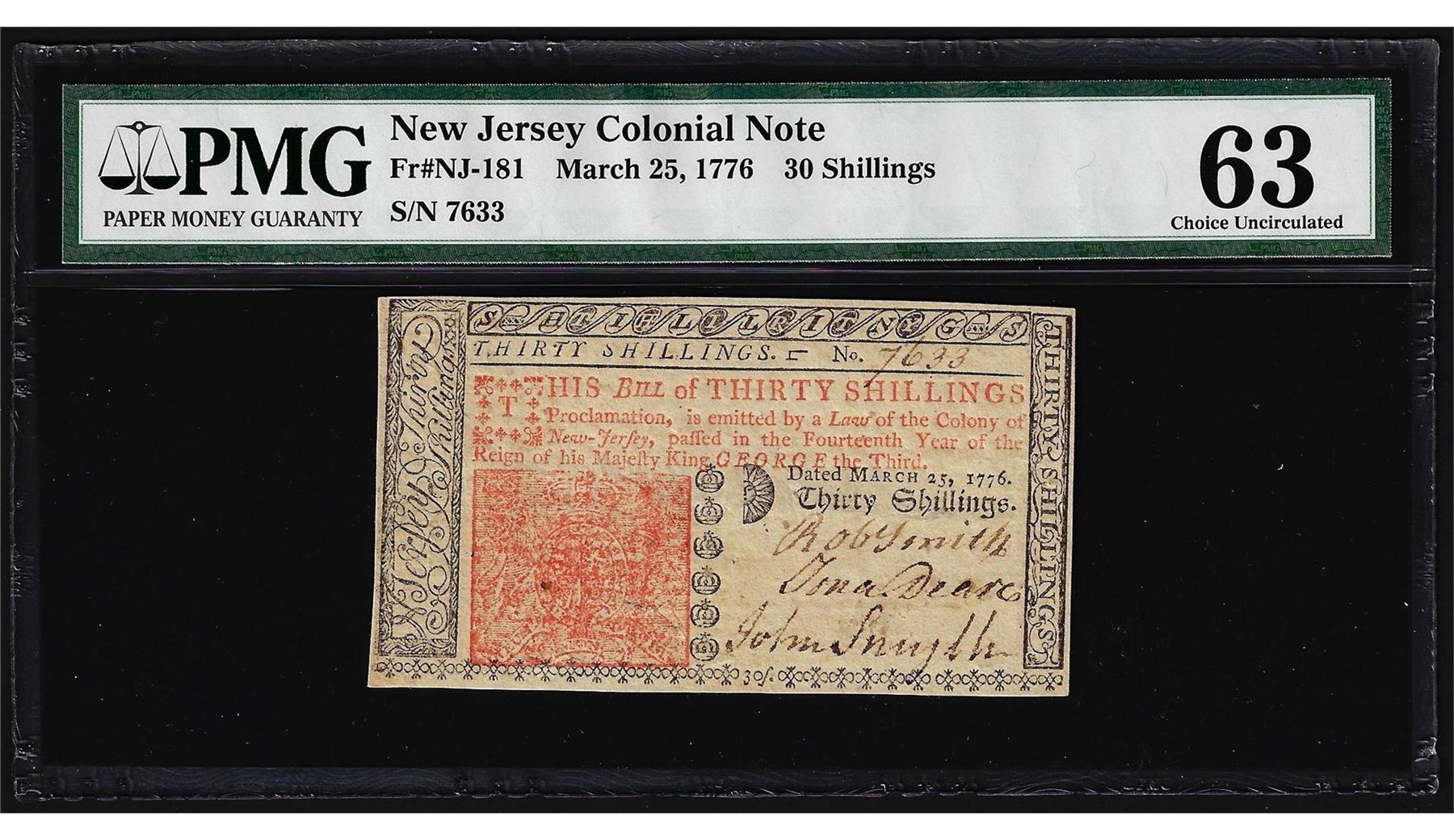March 25, 1776 New Jersey 30 Shillings Colonial Note PMG Choice Uncirculated 63