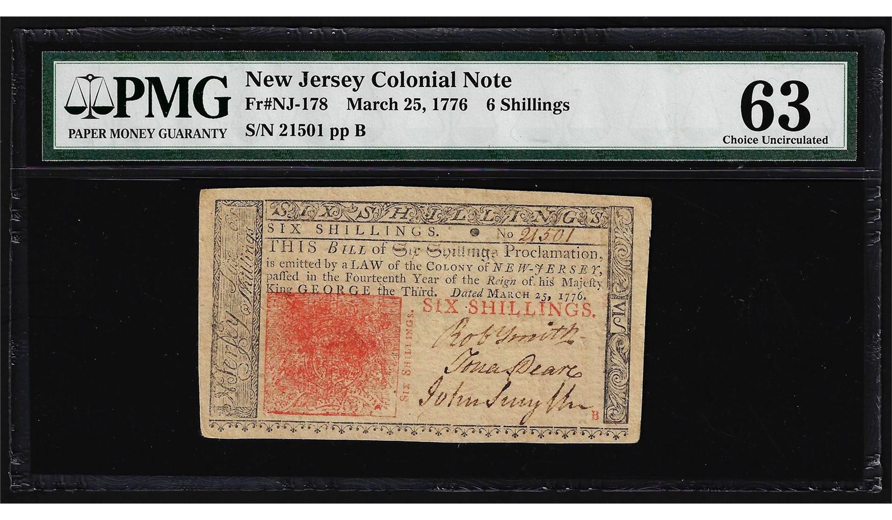 March 25, 1776 New Jersey 6 Shillings Colonial Note PMG Choice Uncirculated 63