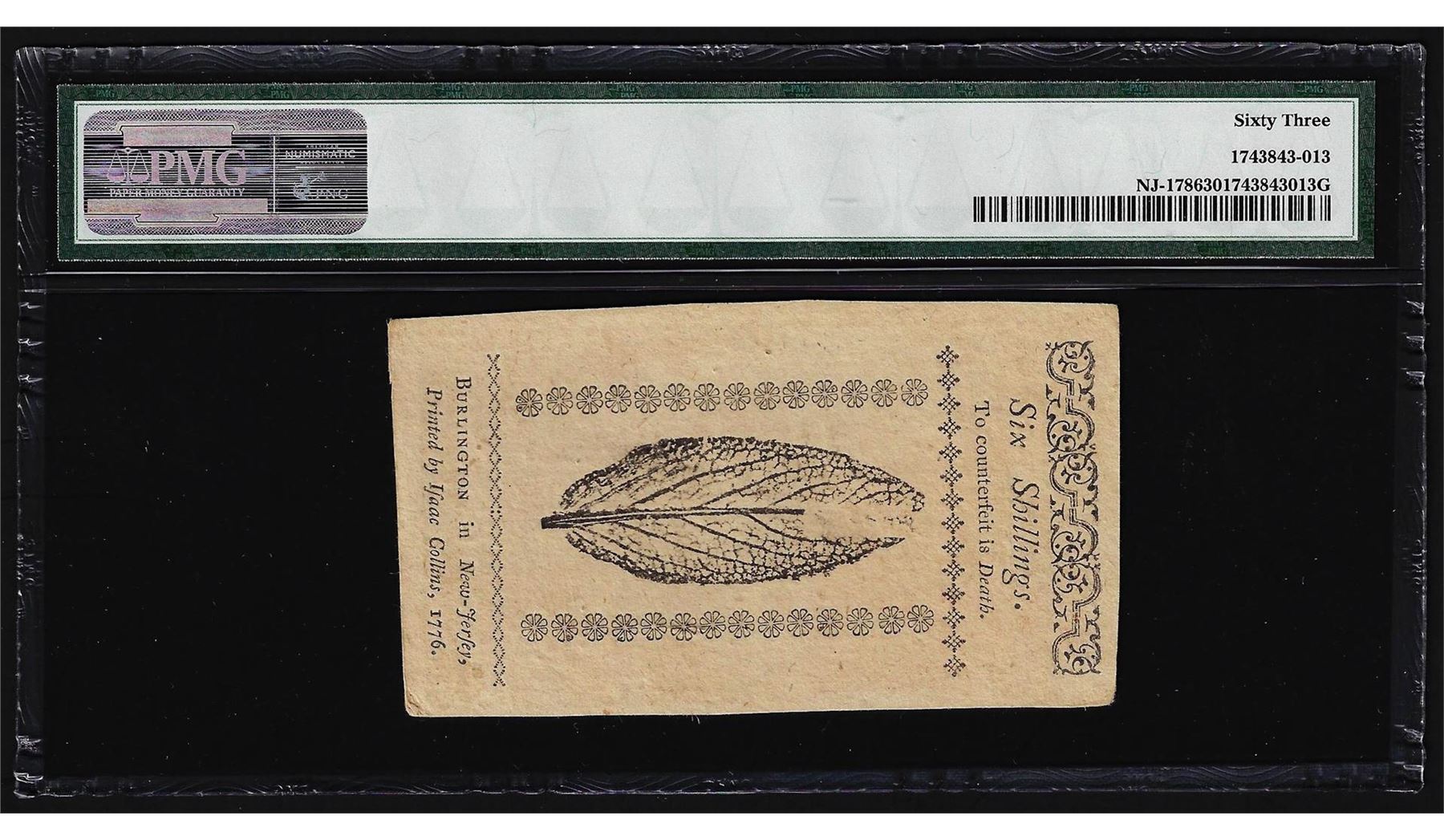 March 25, 1776 New Jersey 6 Shillings Colonial Note PMG Choice Uncirculated 63