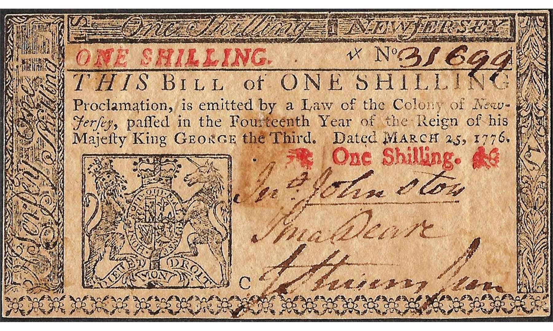 March 25, 1776 New Jersey One Shillings Colonial Currency Note