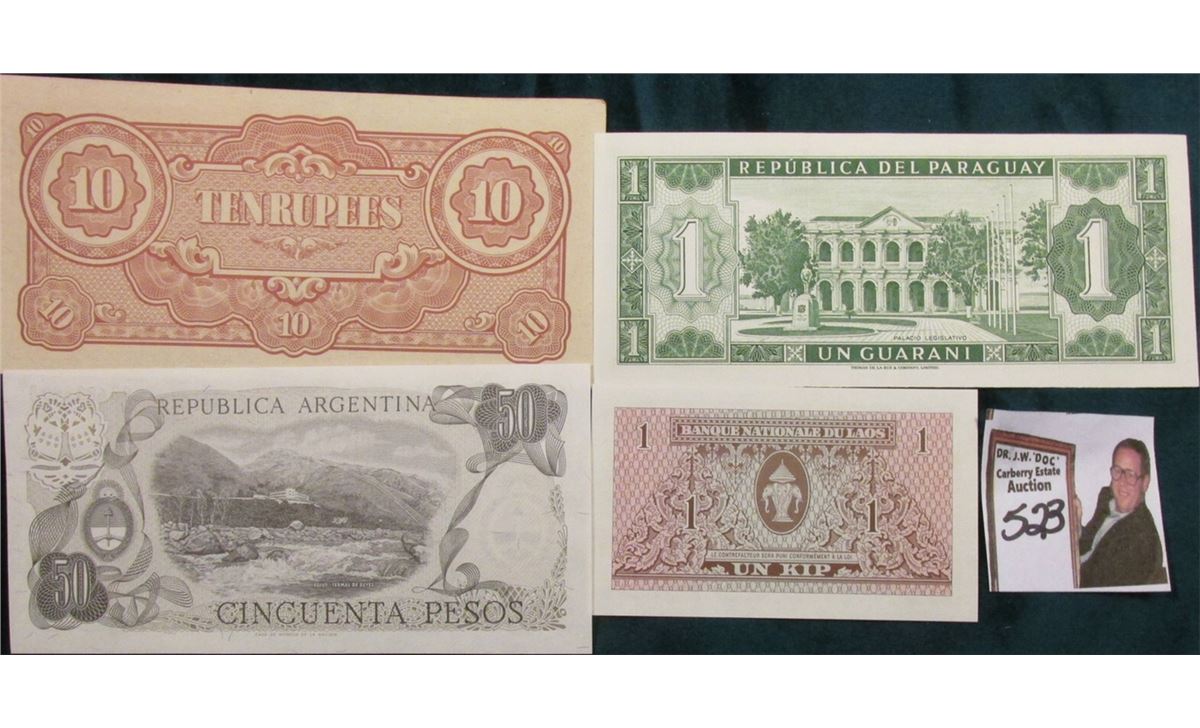 March 25, 1952 Central Bank of Paraguay One Guarani Banknote with security, CU; 1950 Laos One Kip Banknote, CU; 10 Rupees Banknote Japanese Occupation of Burma during WW II, CU; & Argentina 50 Pesos Banknote, CU.