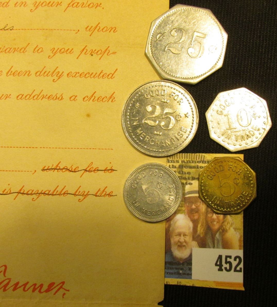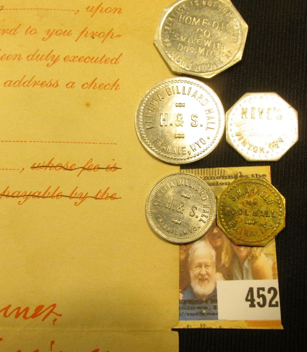 March 25th, 1889 & August 22, 1889 "Department of the Interior, Bureau of Pensions," letters signed by Commissioner sJames Tanner & John Black; & (5) different old Good For Tokens from Iowa & Wyoming.