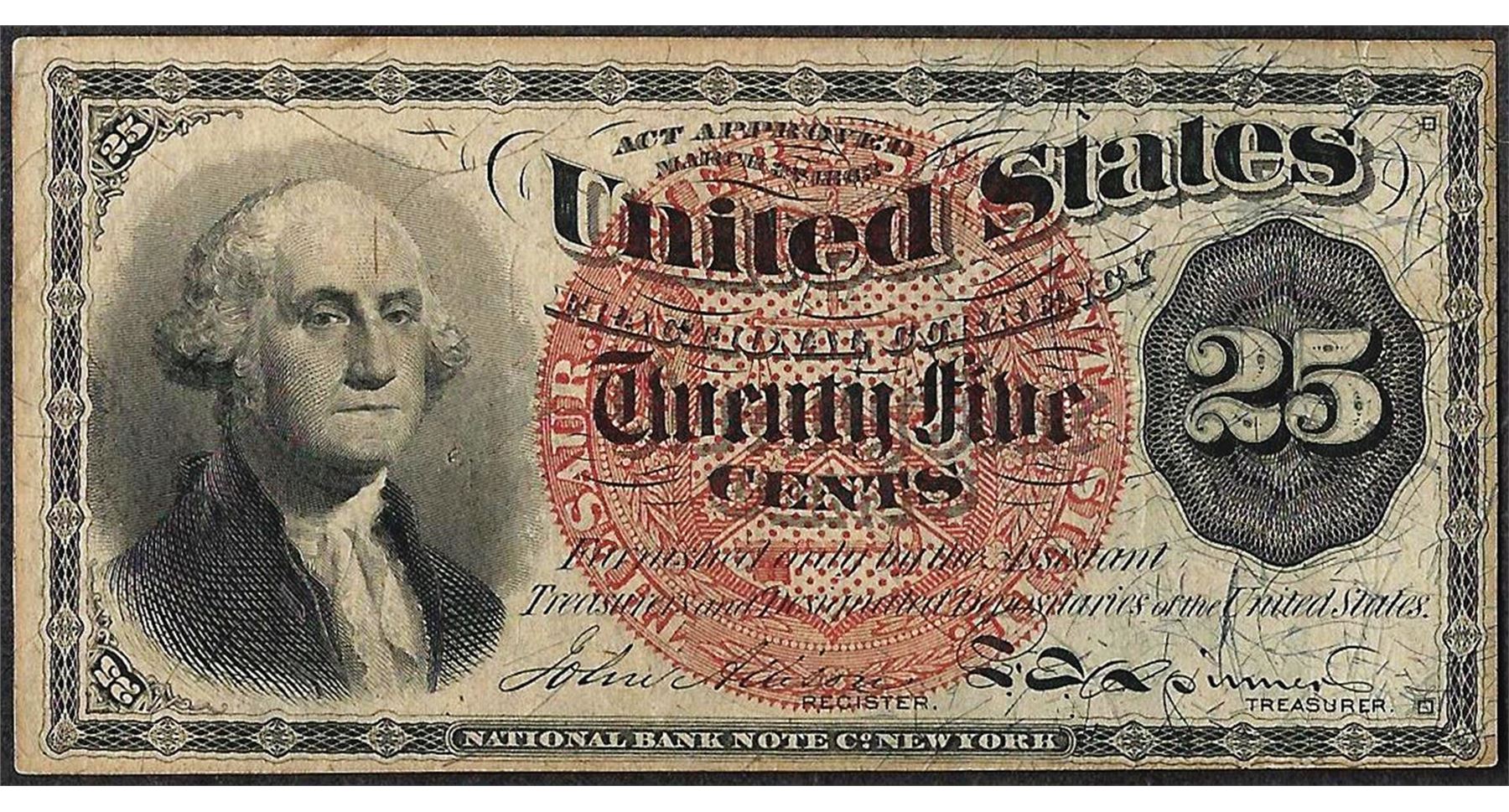 One March 3, 1863 25 Cents Fourth Issue Fractional Currency Note.