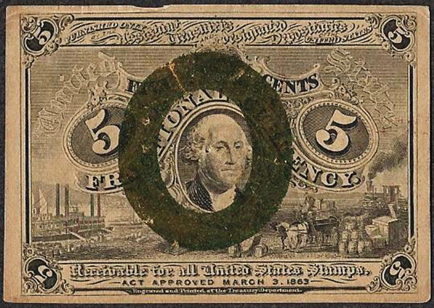 One March 3, 1863 Five Cents Second Issue Fractional Currency Note.
