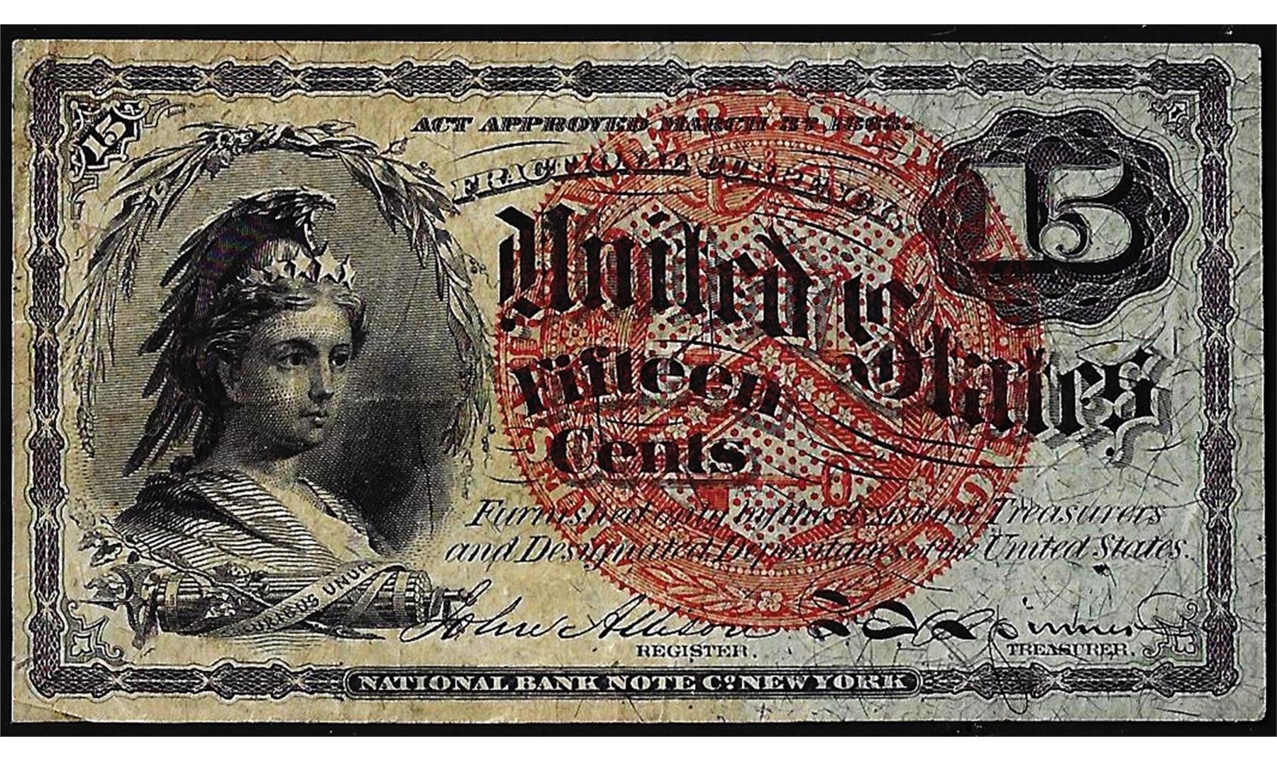 One March 3, 1863 Fourth Issue Fifteen Cent Fractional Currency Note.