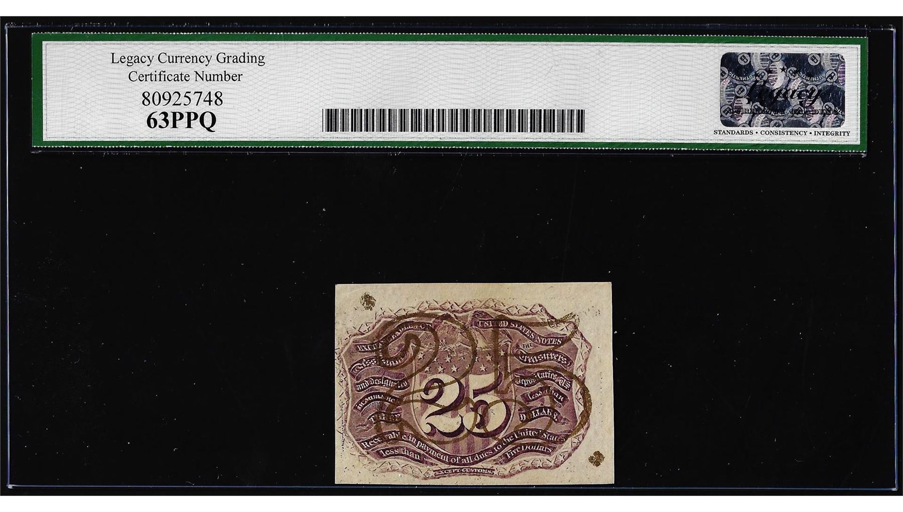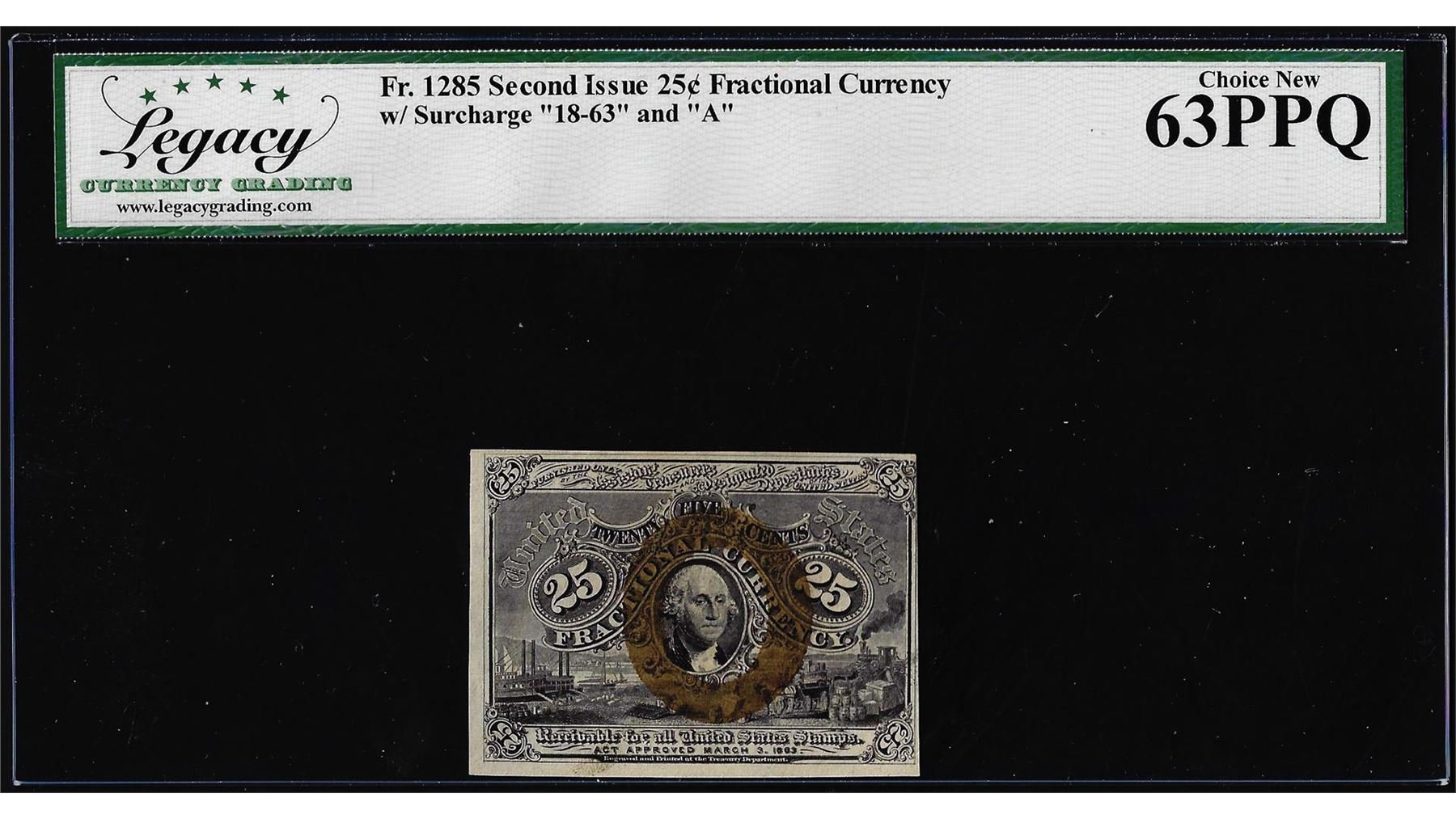 One March 3, 1863 Second Issue 25 Cent Fractional Note Fr.1285 Legacy Choice New 63PPQ. Legacy Graded.