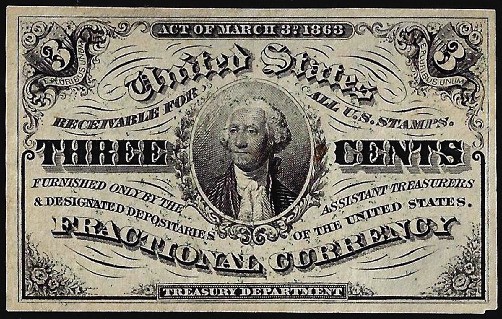 One March 3, 1863 Third Issue Three Cents Fractional Currency Note.