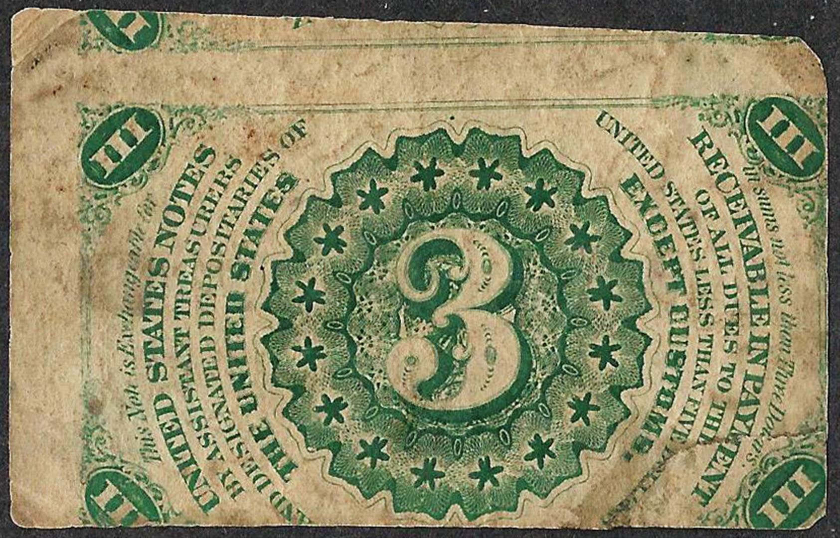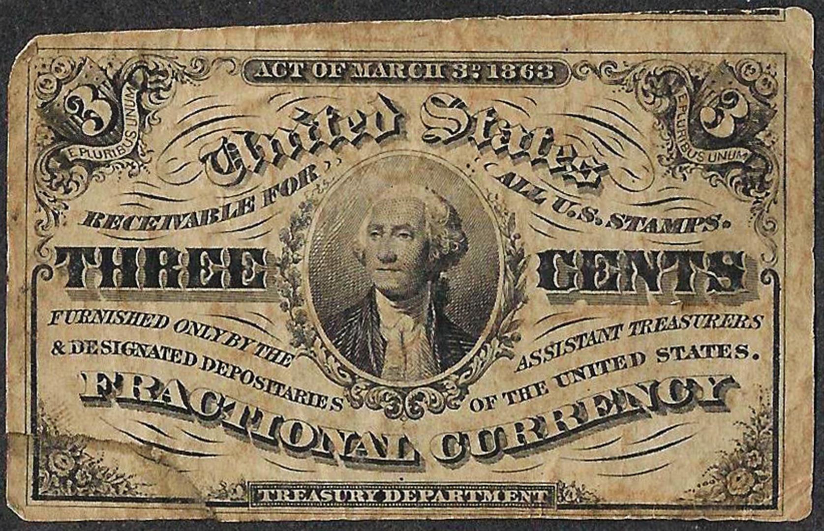One March 3, 1863 Three Cents Third Issue Fractional Currency Note.