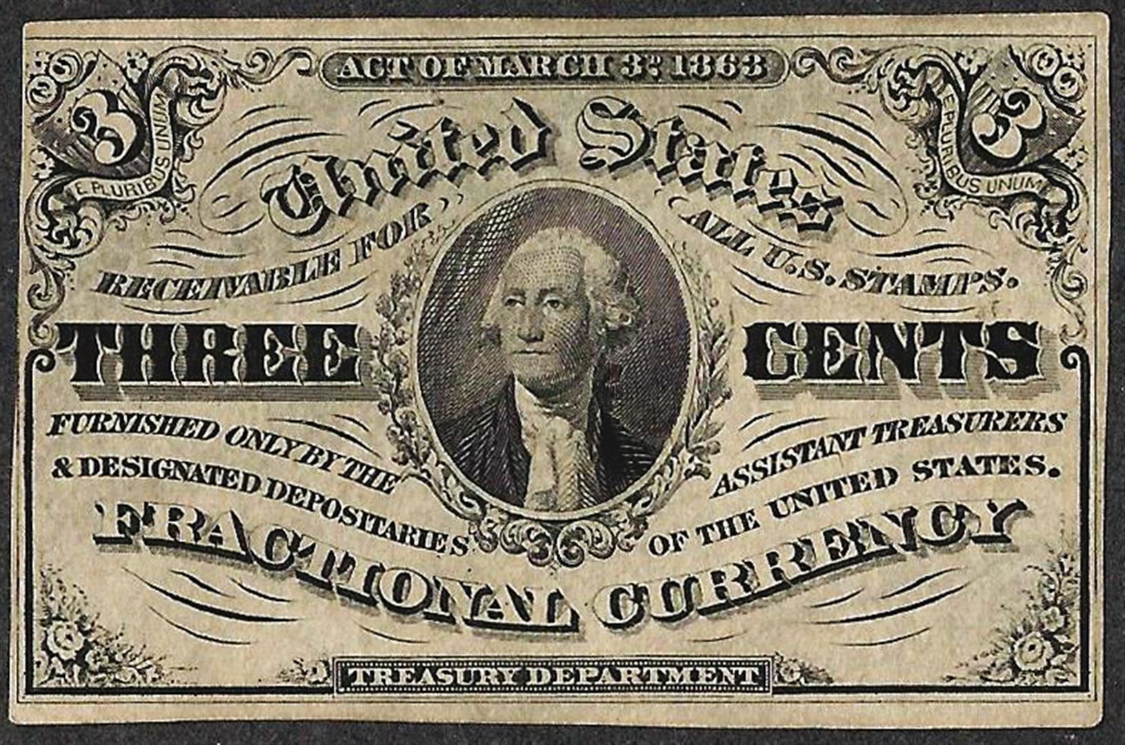 One March 3, 1863 Three Cents Third Issue Fractional Currency Note.