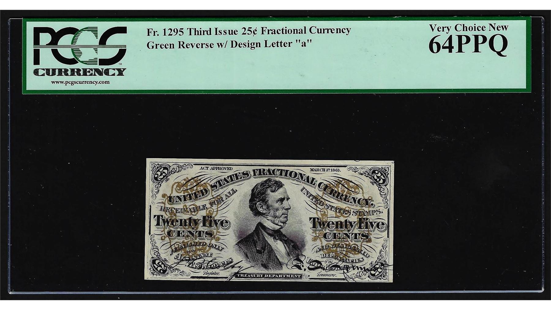 One March 3, 1863 Twenty Five Cent 3rd Issue Fractional Note PCGS Very Choice New 64PPQ. PCGS Graded.