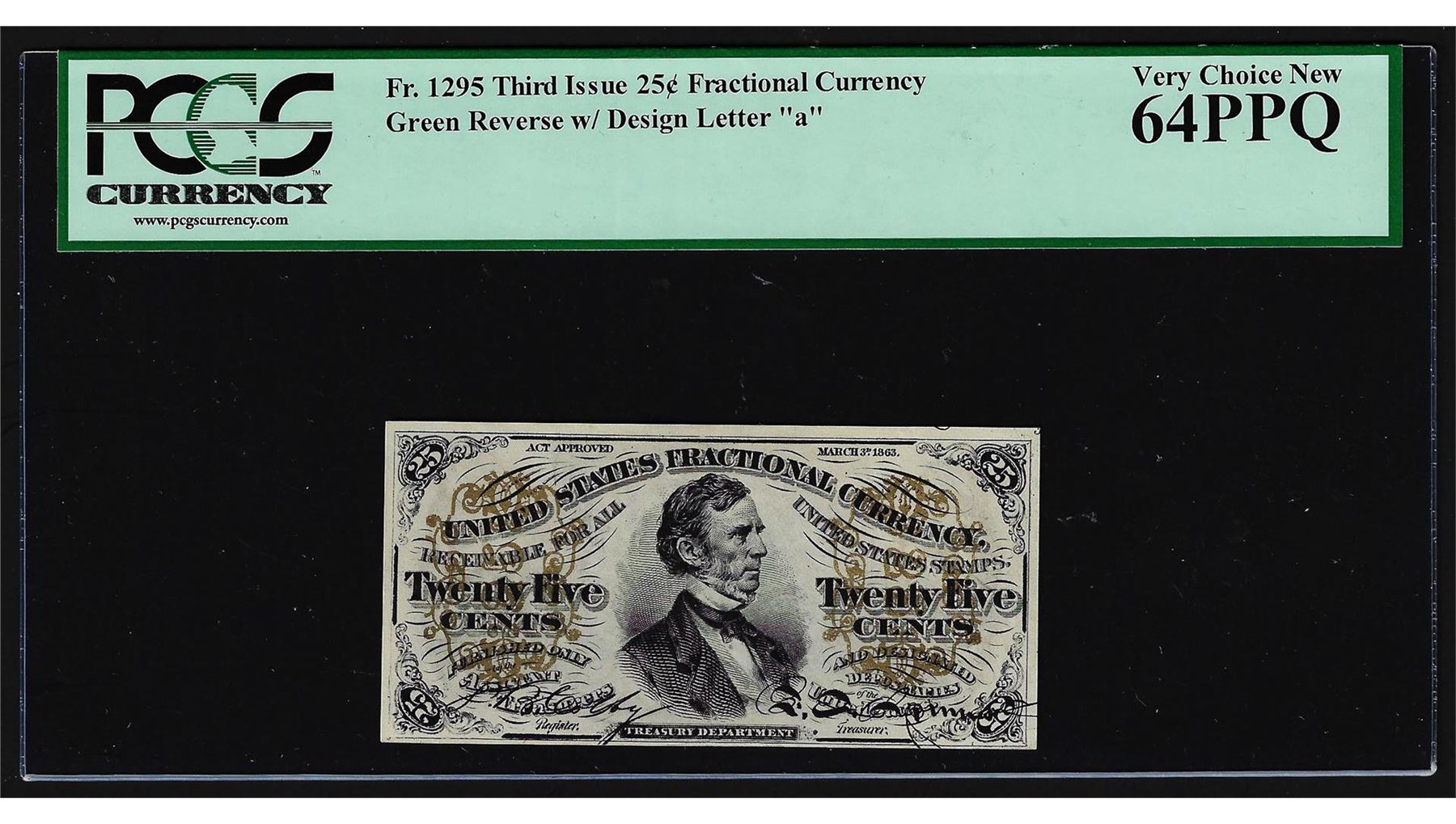 One March 3, 1863 Twenty-Five Cent Third Issue Fractional Note PCGS Very Choice New 64PPQ. PCGS Graded.