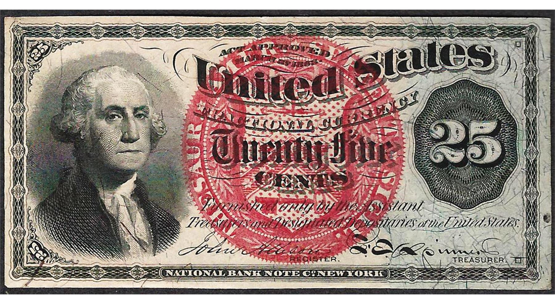 One March 3, 1863 Twenty Five Cents Fourth Issue Fractional Currency Note.