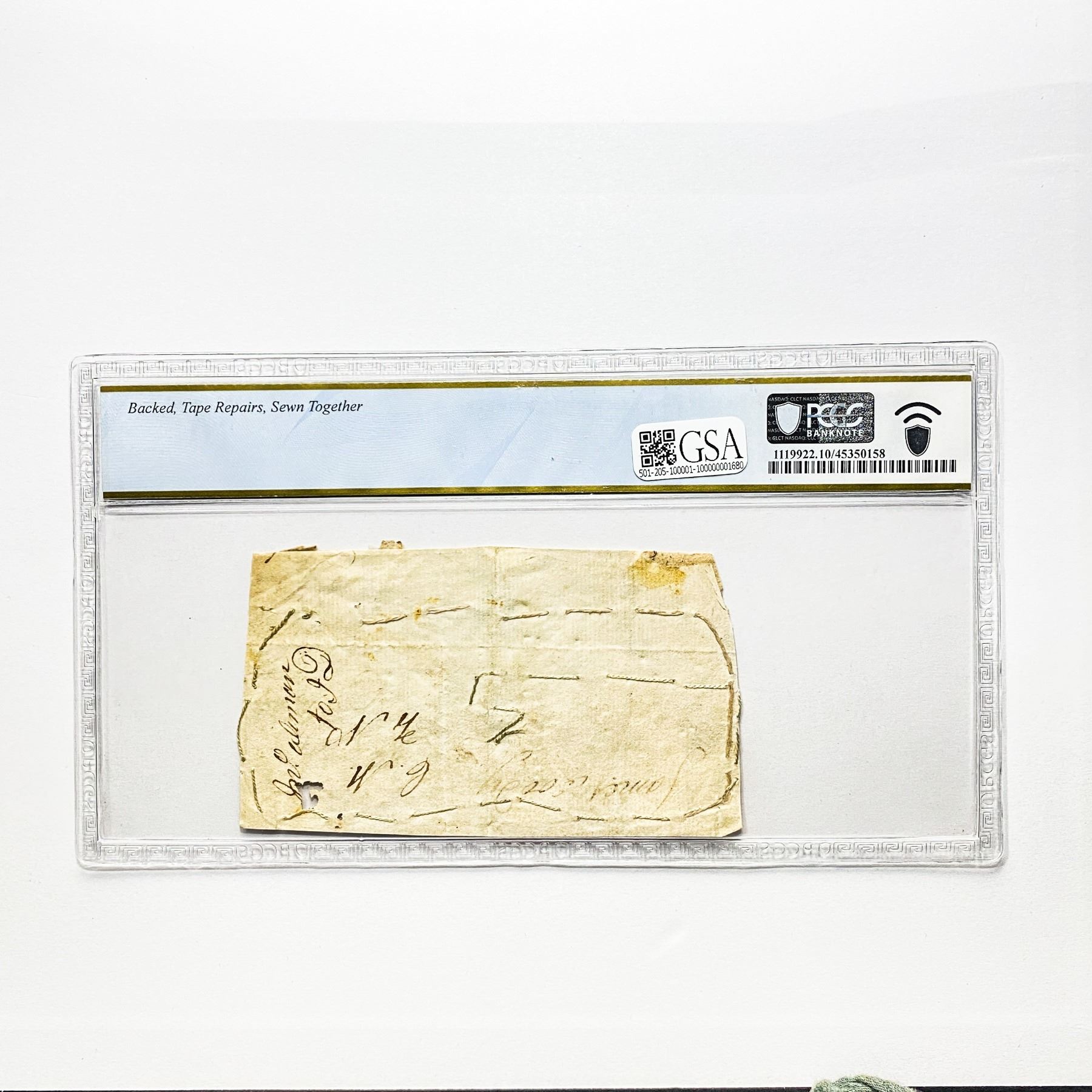 f. Notes sold referencing a third-party grading service are sold “AS IS” without any express or implied warranty, except for guarantee by GSA that they are genuine. Grading, condition or other attributes of any Product may have a material effect on its value and the opinion of others, including third-party grading services such as PCGS Currency and PMG may differ with that of GSA. GSA shall not be bound by any prior or subsequent opinion, determination, or certification by any grading service. Bidders specifically waive any claim to right of return of any Product because of the opinion, determination, or certification, or lack thereof, by any grading service. Certain warranties may be available from the grading services and Bidders are referred to them for further details: Paper Money Guaranty (PMG), PO Box 4711, Sarasota, FL 34230; PCGS Currency, PO Box 10470, Peoria, IL 61612-0470; PCGS Gold Shield, PO Box 9458, Newport Beach, CA 92658. Third-party graded notes are not returnable for any reason whatsoever.