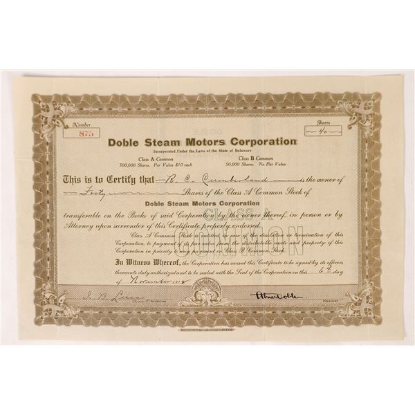 Incorp. State of Delaware 1909. #875, I/U, for 40 shares common stock @ $10 ea. to R C Cumberland Nov 6, 1922. Signed Abner Doble pres. J.B. Lucas a