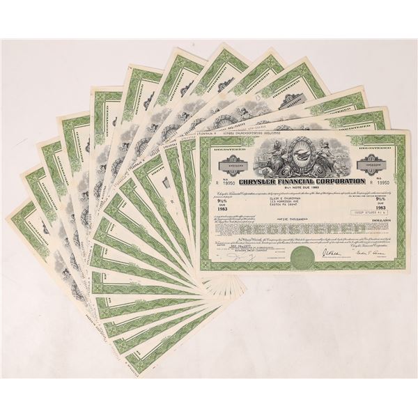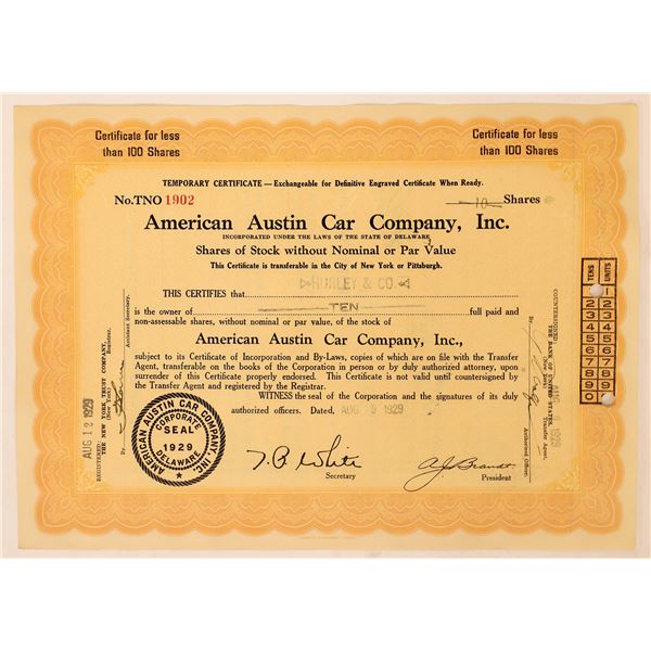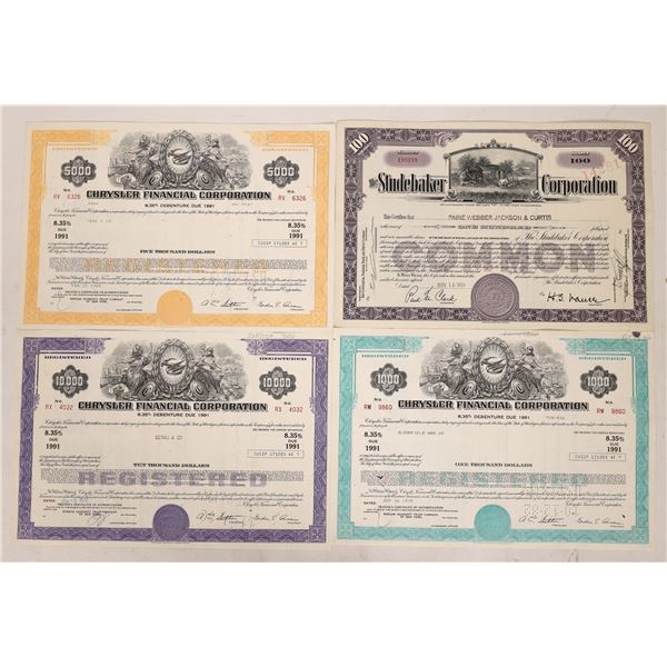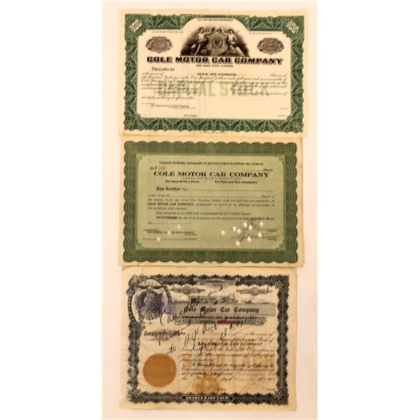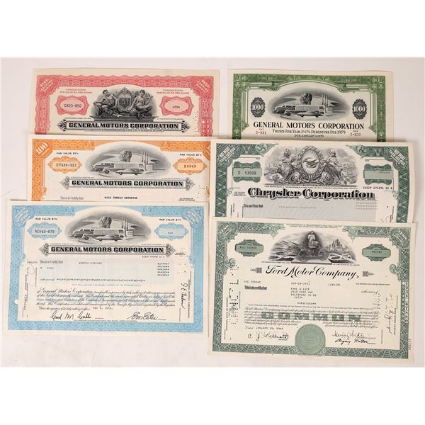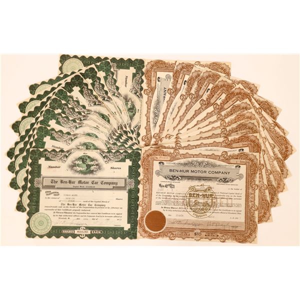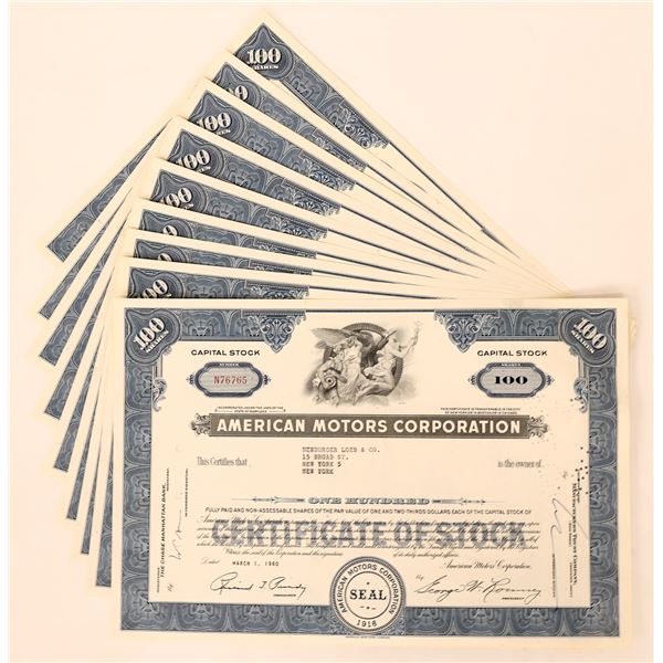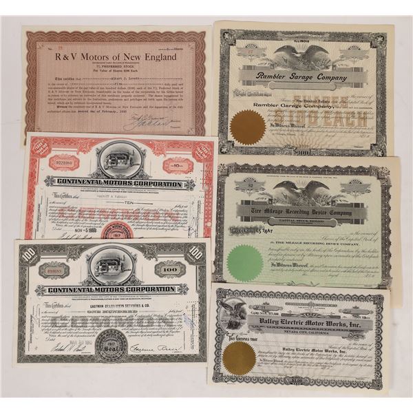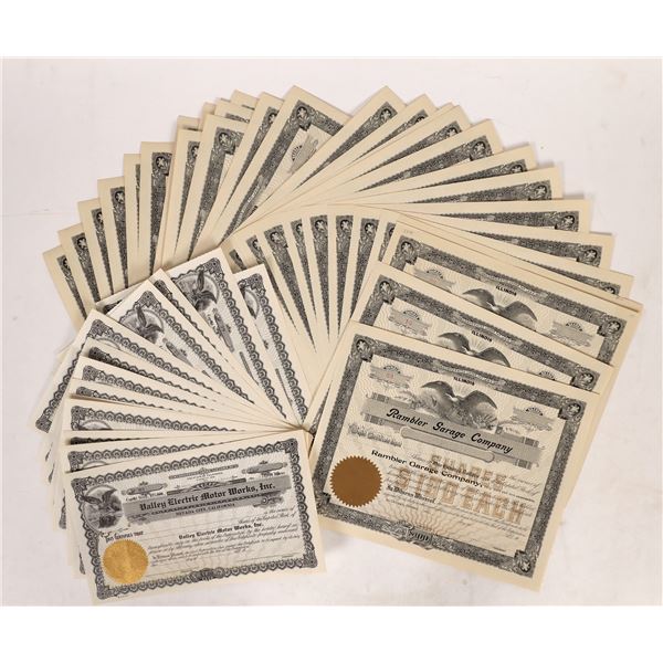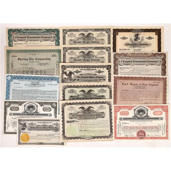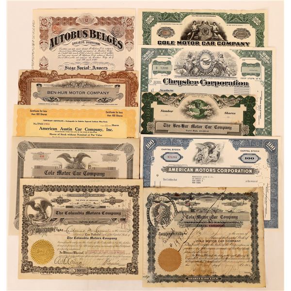 Issued stocks-1922 Columbia, 1929 American Austin, 1917 Ben Hur 2 different, 1960 American Motors, 1912 Cole, 1981 Chrysler. Unissued-2 different Cole
