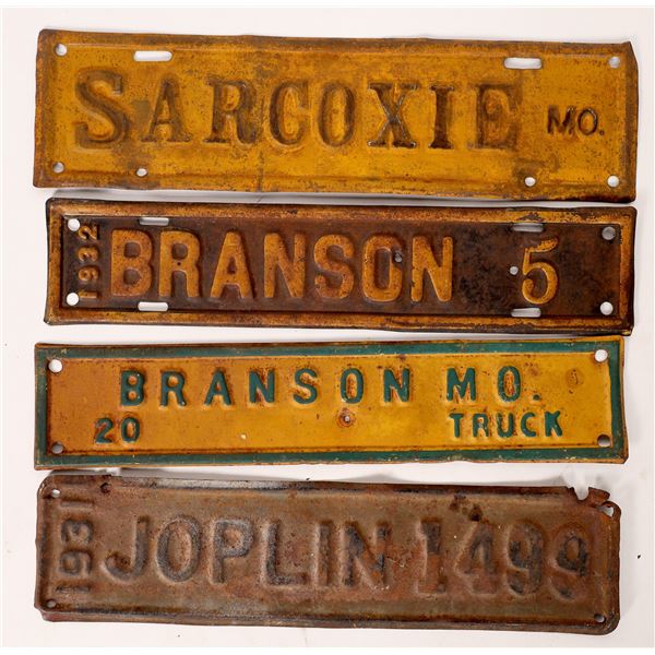 4 unusual about 3x12" licence plates. 1932 Branson 5, 1931 Joplin 1499, 20 Branson MO Truck, Sarcoxie Mo. Condition varies, please inspect. ...