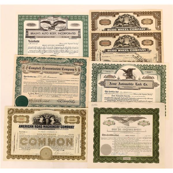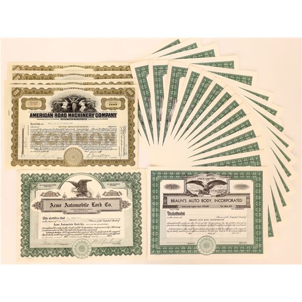 About 20 automotive stocks. Issued 1923 Acme Automobile Lock, 1919 American Road Machine x4. U/I-about 15 Braun's Auto Body. Ken Prag C...