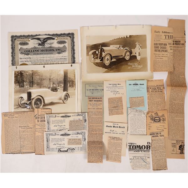 1919 Collins Motors Corp. Stock. Lot of 16. Two photos: one of the actual car and the ad that was to be placed. 13 newspaper articles regarding the