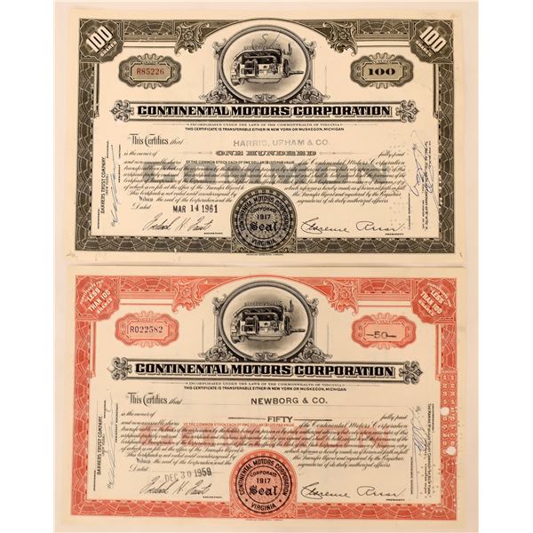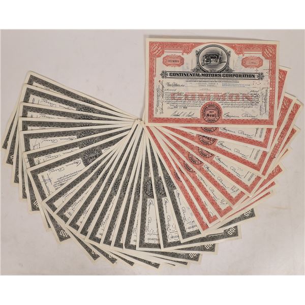 A group of 29 stock certificates from Continental Motors Corporation, incorp. Virginia, I/C, two colors (nine red, 20 black), c1952-62. See photo(s) f