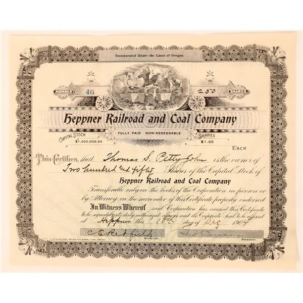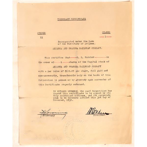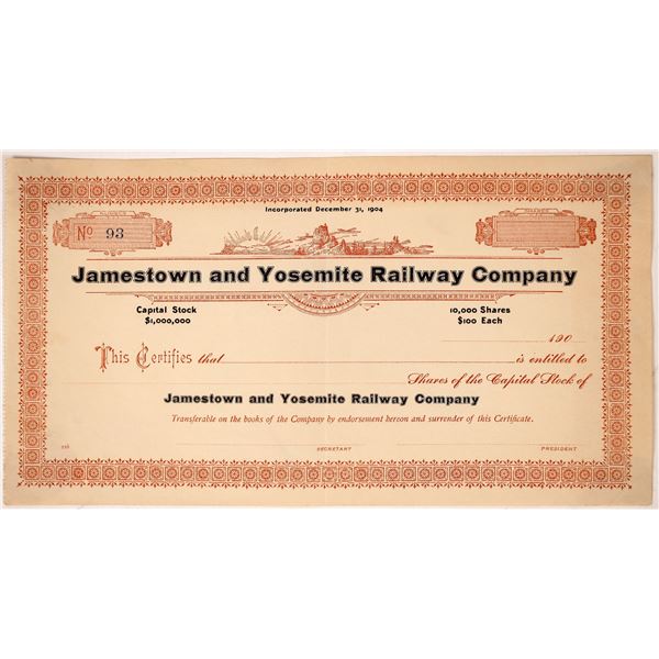 Extremely rare. Incorp. May 28 1888 State of Calif. #180, I/C, 25 shares of capital stock @ $25.00 ea. to Ames Detrick Jan 12,1889. Signed J. Chur