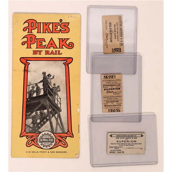 1906 Pike's Peak By Rail brochure. 2x Silverton Northern RR tickets, Magma Arizona RR Ticket, all 3 are 1.25x2.25". Colorado