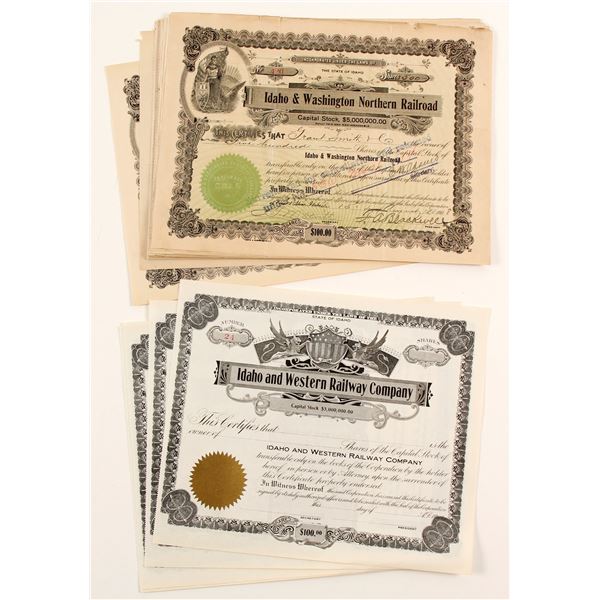 23 certificates. 18 Idaho & Washington Northern Railroad, 9 issued/cancelled, 9 unissued, Nicely engraved black border, green embossed corp sea...