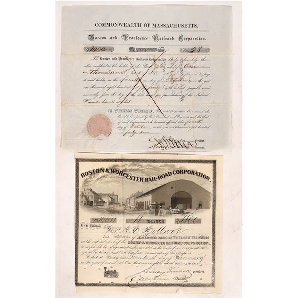 Two early railroad stock certificates: 1) Boston and Providence Railroad Corporation Bond No. 28 for $1000, October 4th 1849. Railroad vignette; hand