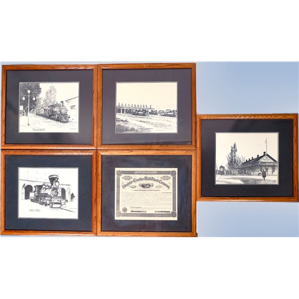 Four oak framed prints by Andrew Saar, c. 1977 depicting the Virginia & Truckee railroad, and a copy of a Virginia & Truckee RR bond. Prin...